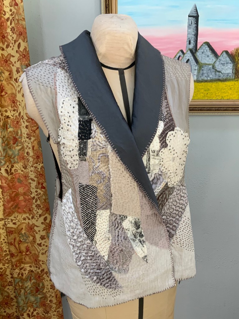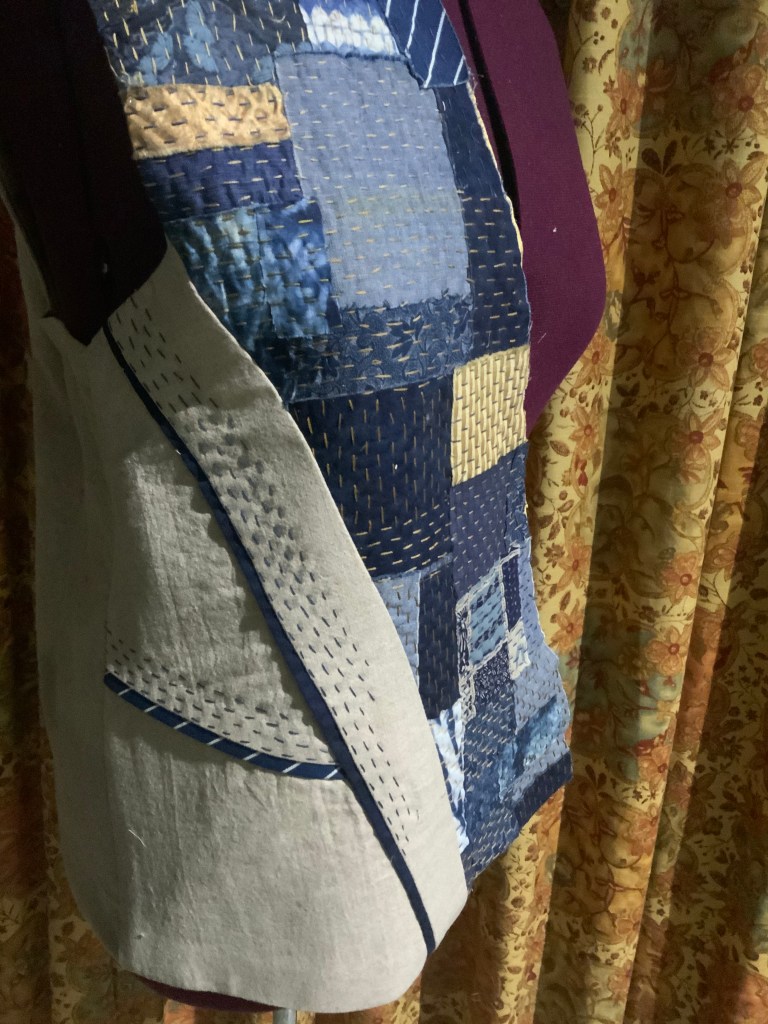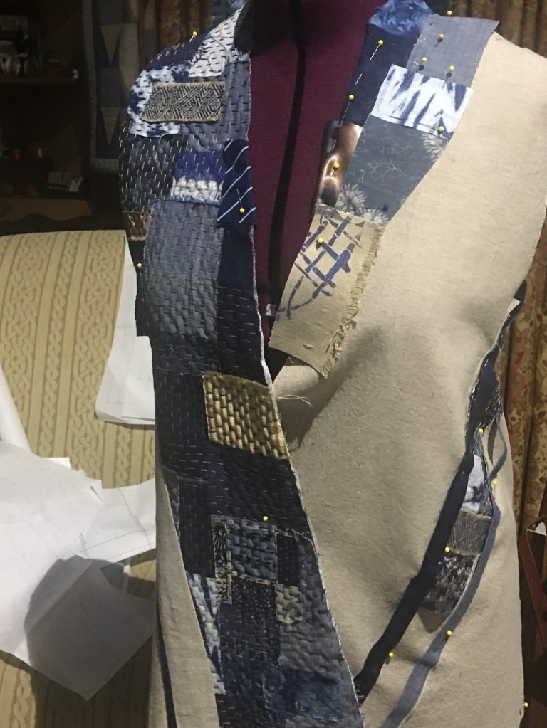 Moving on to the left side I had a new plan. I wanted less of the ‘Boro’ as I felt the vest would look ‘lighter’ and have more movement in the design. I again made a pattern and came up with an idea I liked,and after I pieced it together I put it on my dressform and decided on my fabric placement for the neck edge. After I was happy with it, I pinned the pieces in place and then hand stitched them to the linen.