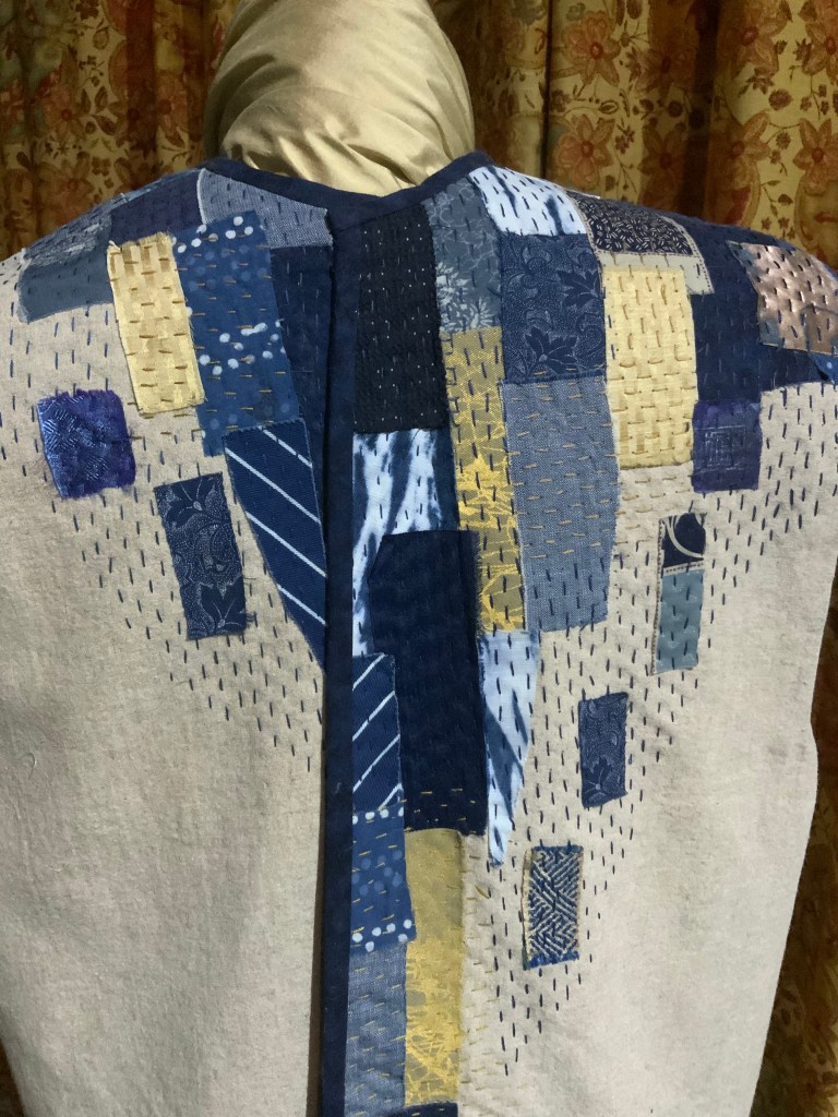 My next task was deciding on the back of the vest. I followed the same steps as the front, tracing the pattern pieces and played with a layout. I wanted to continue the Boro design over the shoulder so I had a seamless transition. Again I just kept adding textiles until I liked the outcome. Adding the hand stitches was enjoyable and I didn’t overthink it. When both sides of the back were finished. I put the vest together.