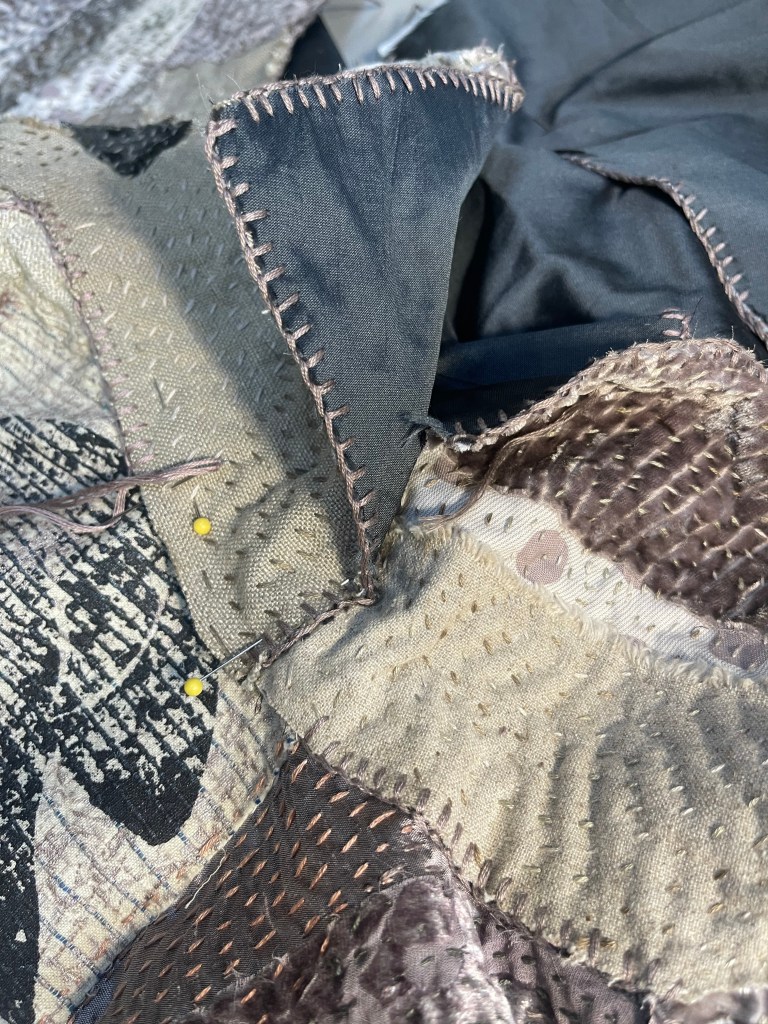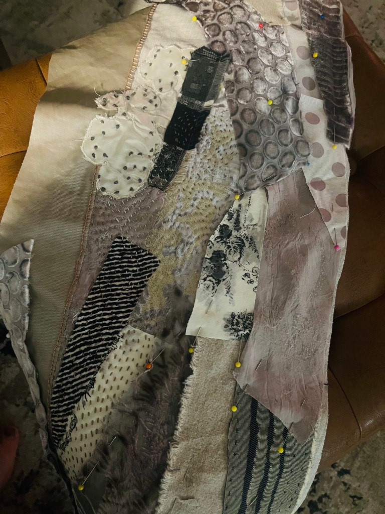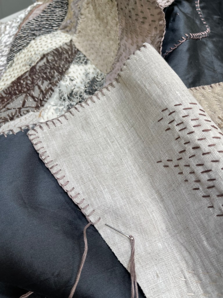 I have spent many many hours making garments on a sewing machine, and I didn’t plan on it, but I ended up making this garment entirely by hand. I have a huge obsession with hand stitching and have been making lots of samples and eventually came up with an idea to use all the ‘parts’ I had started. My collection of fabrics and leftover ‘gems’is extensive so I don’t have to buy fabric for new projects. I started without a plan for a design,and just used a collection of fabric pieces from previous projects and years of collecting. I love the combination of neutrals and pops of black.