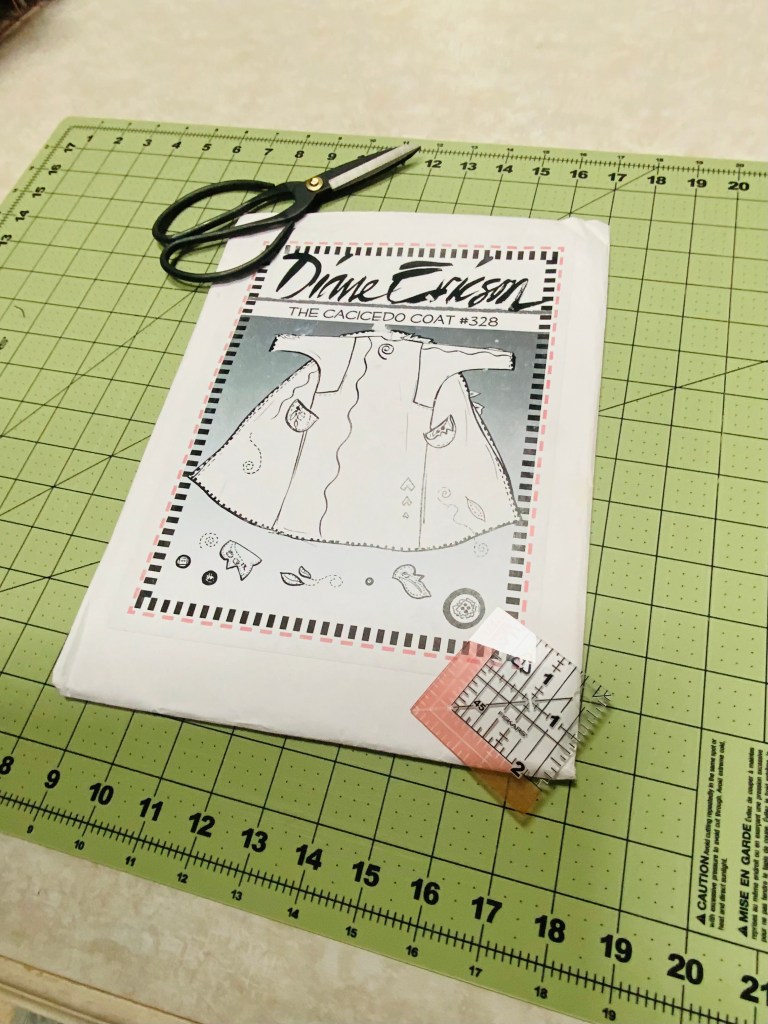 I started 3 pieces, one for each front and a larger piece for the back. I don’t design too much until I decide what I’m going to make. If I go to far, I can’t cut through the stitching and I don’t want to undo the work I have spent time on. My go too patterns are by Diane Ericson and I choose The Cacicedo Coat #328. I copied the front and back pattern pieces, and cut my main fabric, a glazed Linen.