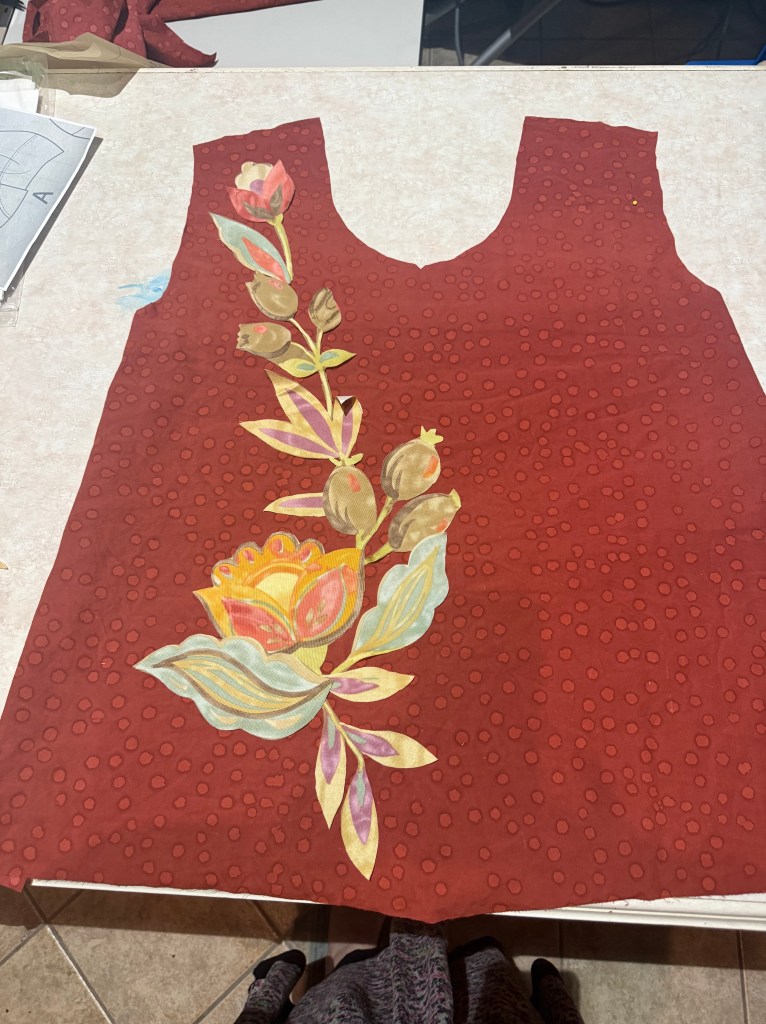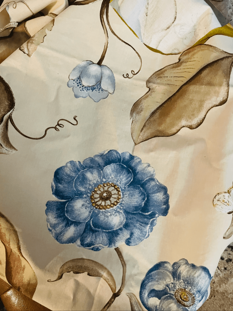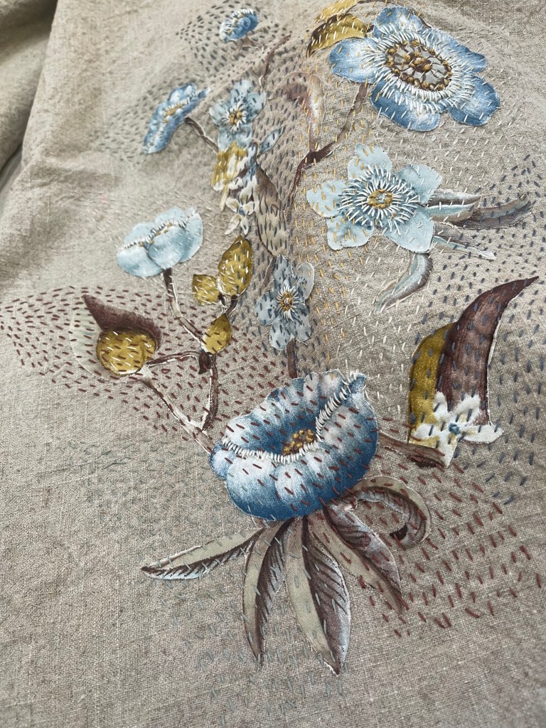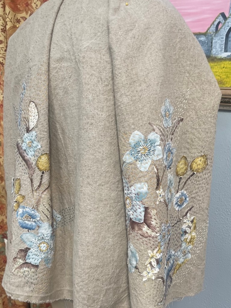 A favorite piece of fabric had the look and color that inspired me , so I began to cut the flowers , greenery etc.apart. I love Linen, so a rustic piece that I had wanted to use for a while was the perfect background. At this point I haven’t decided exactly what I was going to make but I knew it was going to be a Jacket.