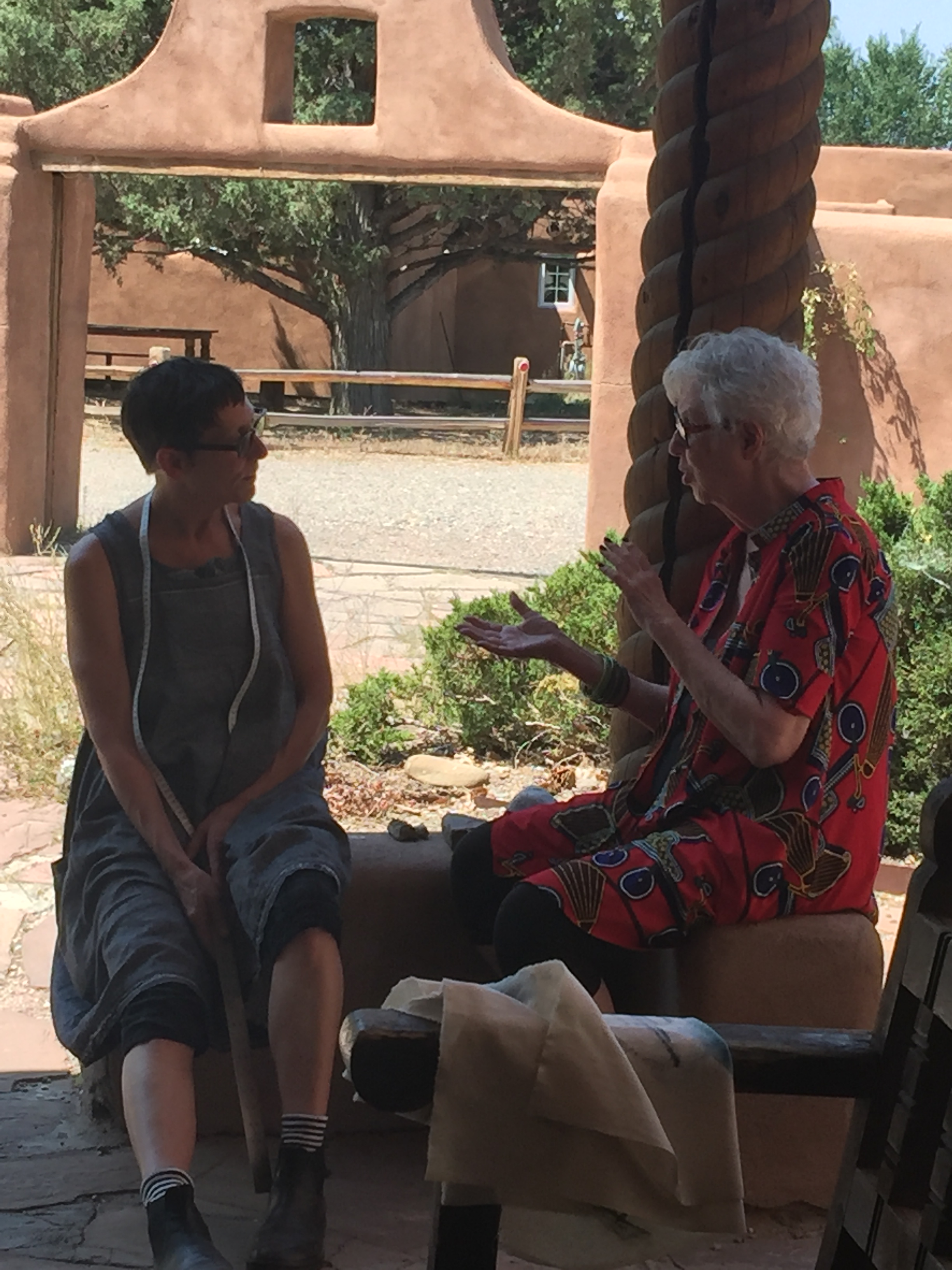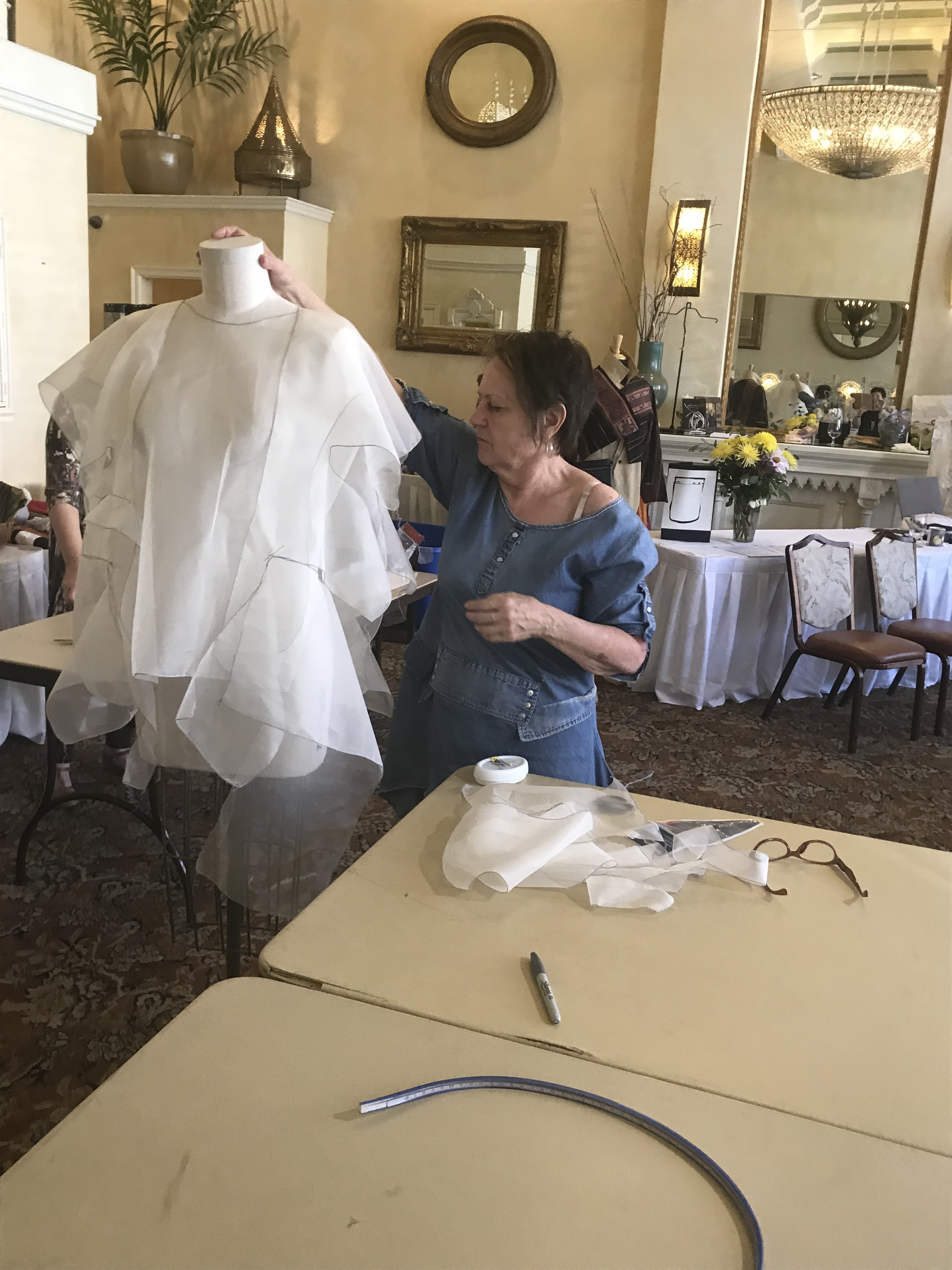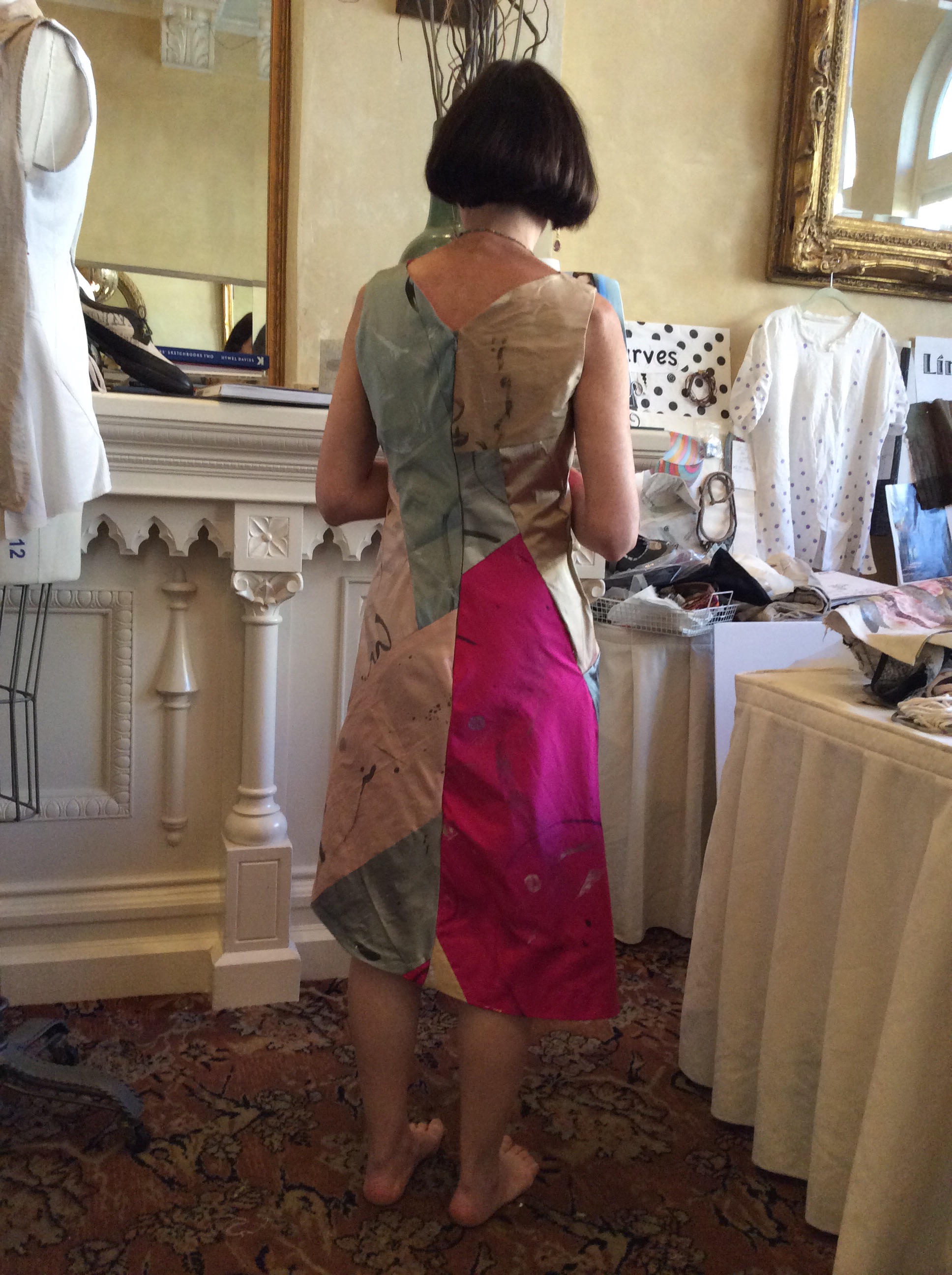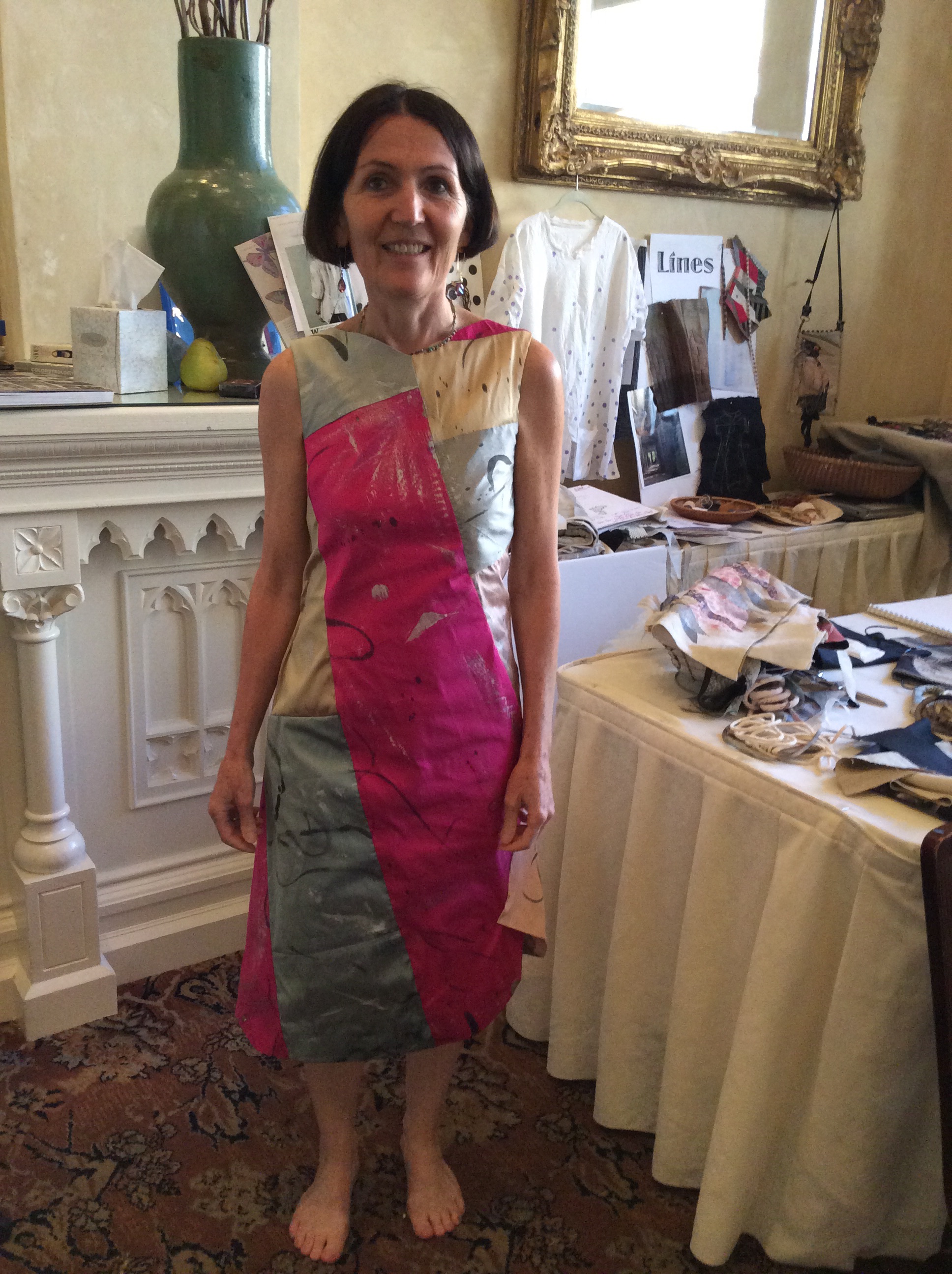 Making our own fabric is a topic that Diane will work on in June. But last year Sylvia had pieced together different shades of silk and then hand painted it. Together we draped a dress on her body and by the end of the workshop, she had a dress ready for any special outing.