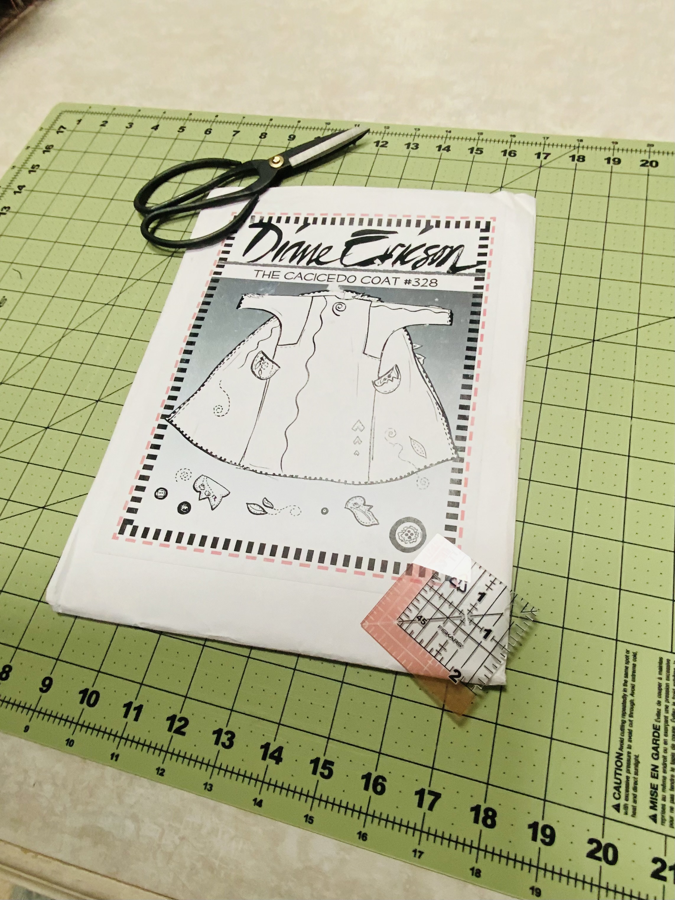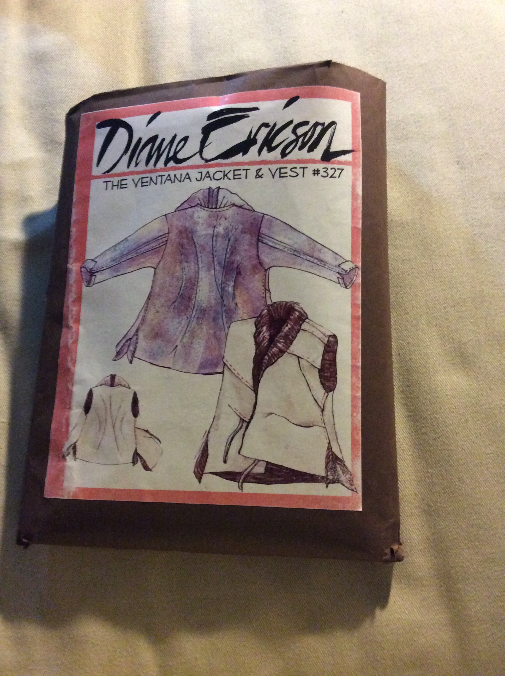 I started 3 pieces, one for each front and a larger piece for the back. I don’t design too much until I decide what I’m going to make. If I go to far, I can’t cut through the stitching and I don’t want to undo the work I have spent time on. My go too patterns are by Diane Ericson and I choose The Cacicedo Coat #328. I copied the front and back pattern pieces, and cut my main fabric, a glazed Linen.