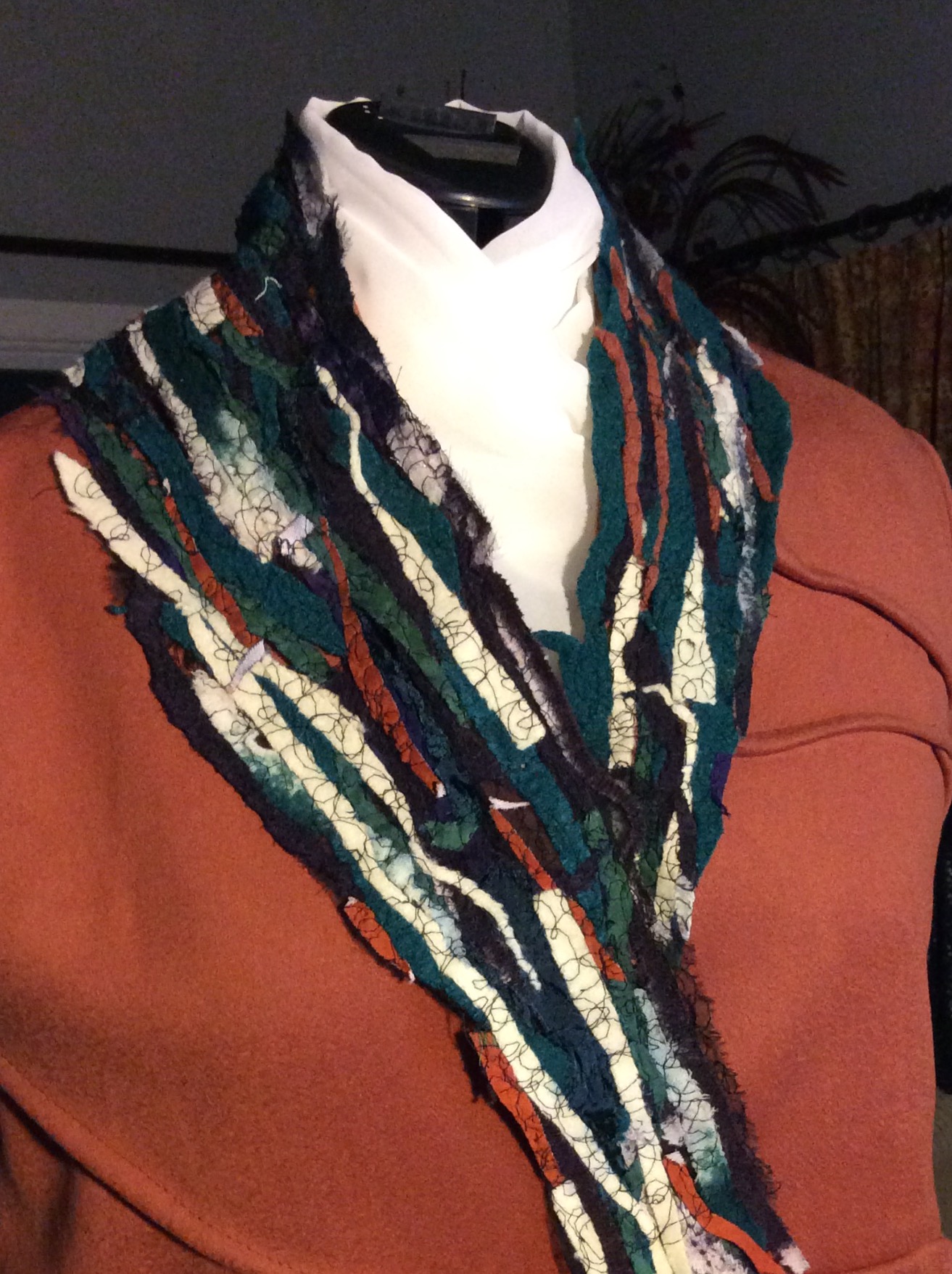 I loved her technique of using scraps and ‘bits’to make interesting pieces of textiles that has lots of uses. I decided to use my piece as a collar on Diane’s Ventana Jacket pattern.