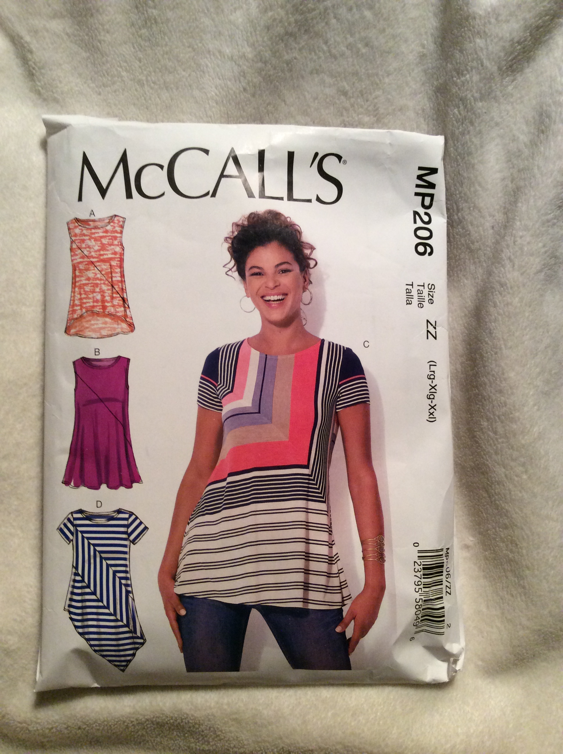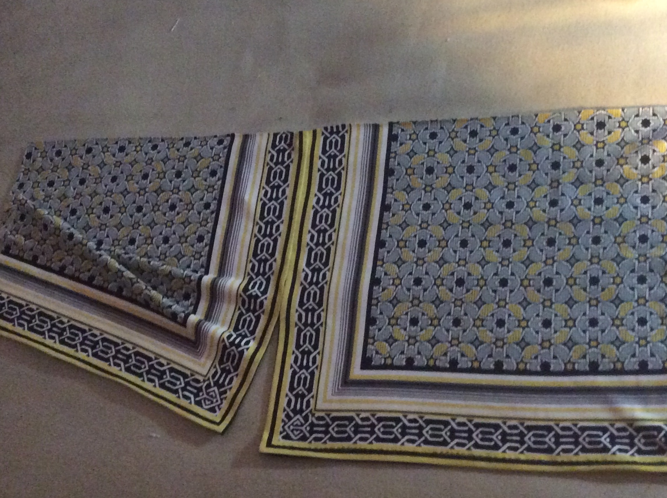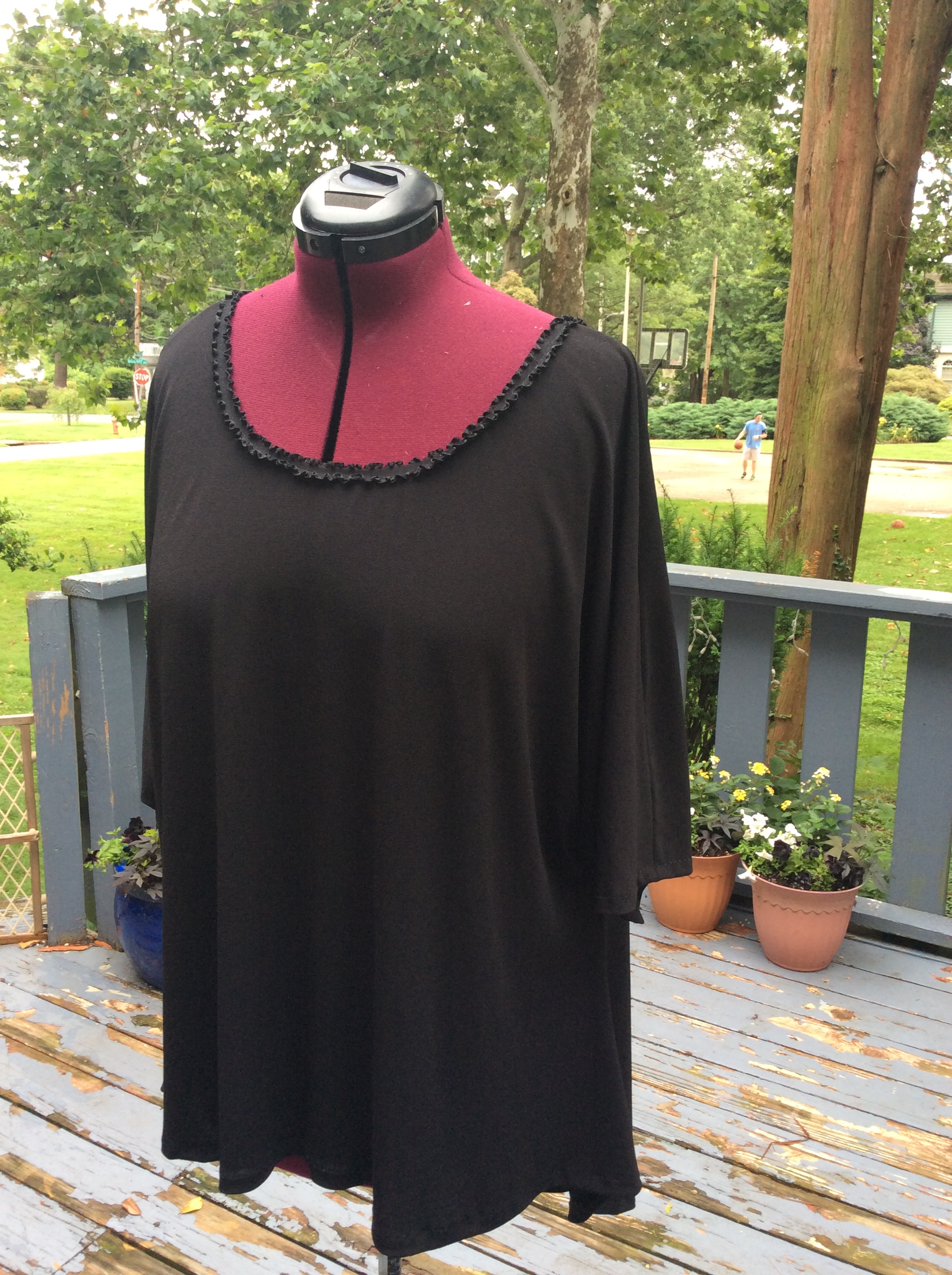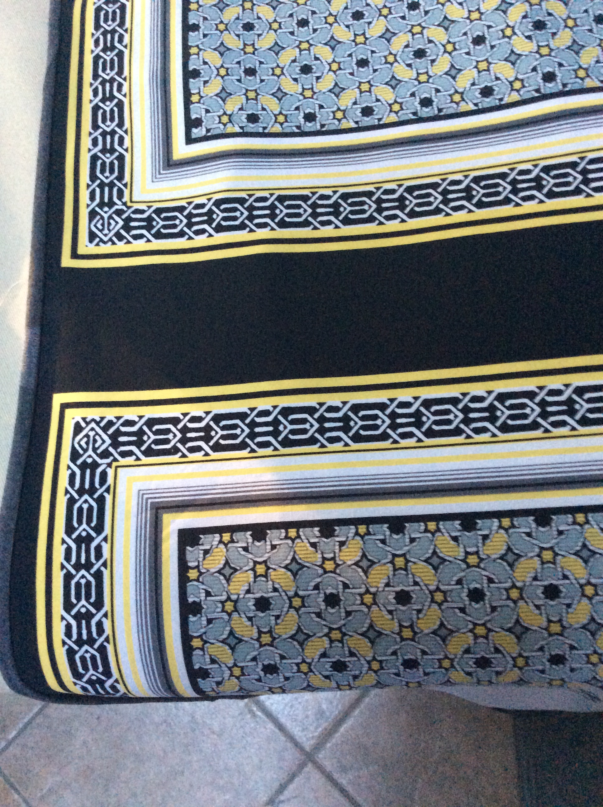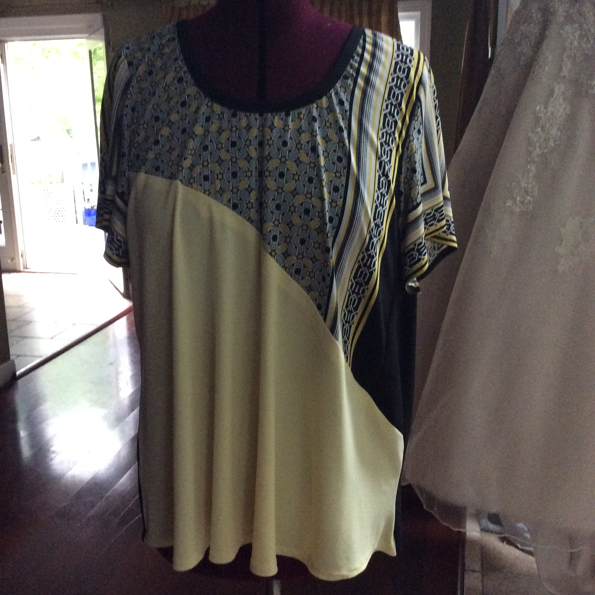 I wanted some yellow to match a piece of jewelry . This is a knit. Did you ever get some fabric with a square print and not know what to do. I don’t think a square in the center is flattering. I decided to use part of it and make the rest black and a solid yellow . I used the McCalls pattern for this one and played with the placement of the pattern. I wanted a sleeve and also played around with that. I did not have a lot of fabric so I finished the slit in the center first, and then used what I had to cut out the sleeve. I used a purchased fold over elastic to finish the neckline.