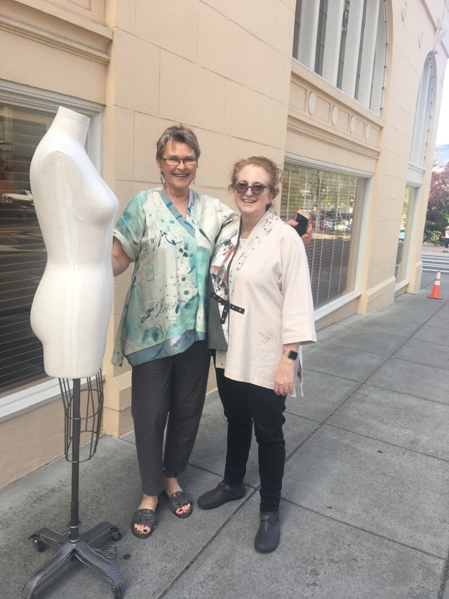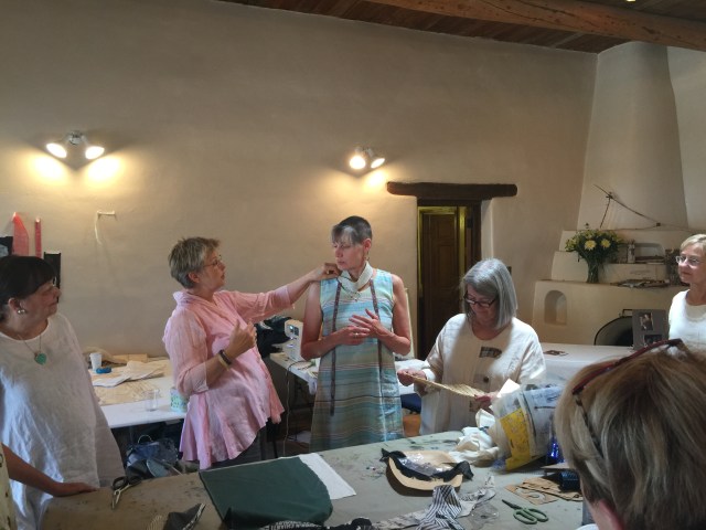 I was very excited when I heard that Sandra Ericson was going to be Diane’s guest teacher as I had wanted to take a class from her but it never worked out. Sandra’s expertise is in draping and pattern making and she shared a lot of both with us. She brought along some dresses that she had made and one in particular, a dress made from 4 squares, was very popular. JoAnn got right to work and completed one that she wore to The Ashland Art Center. Karen and Sylvie were lucky to go home with patterns draped , fitted and ready to sew. She also brought us some slide presentations that we enjoyed. Her website centerforpatterndesign.com
