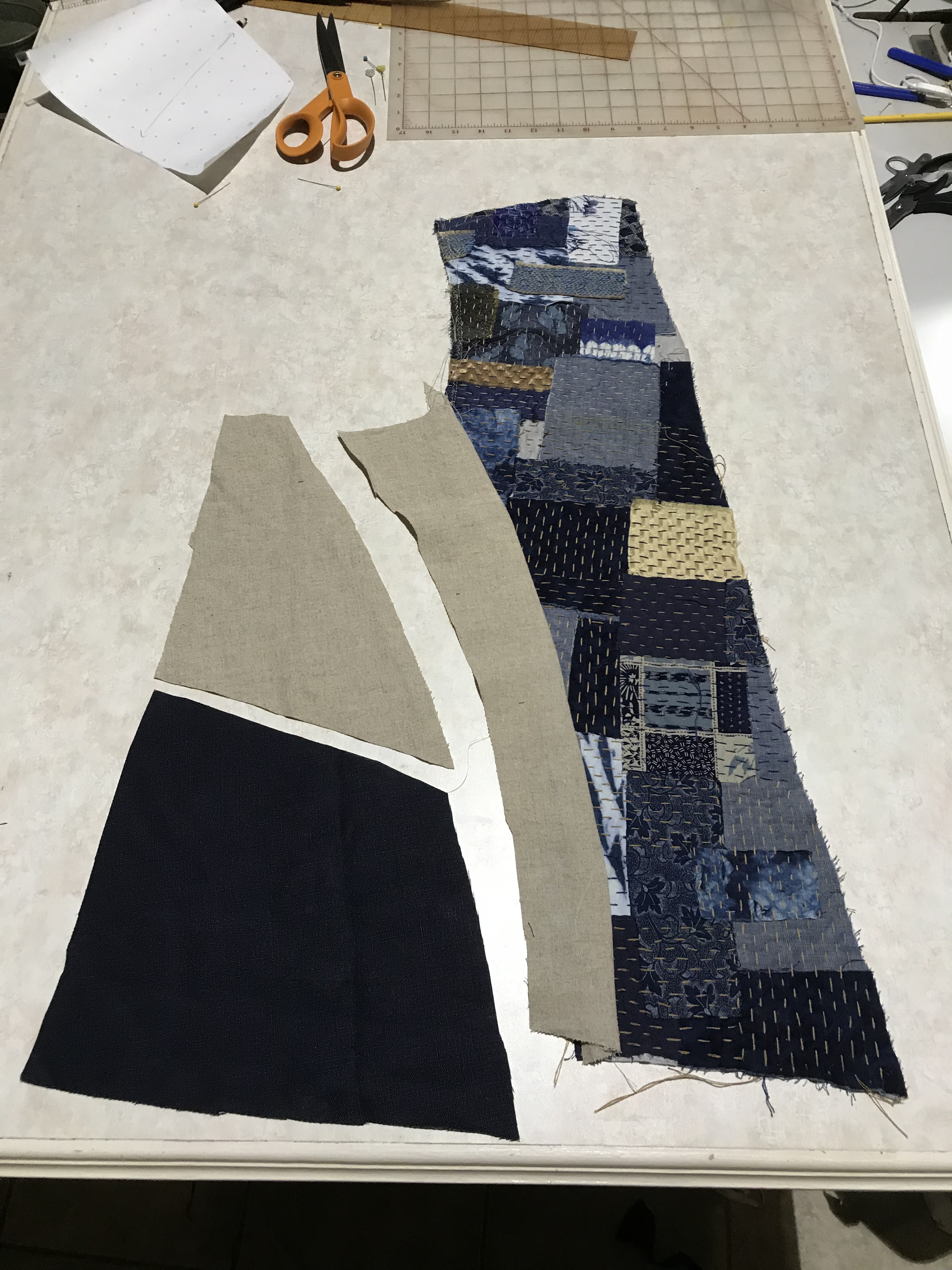I cut different fabrics and played around with fabric type and color, but I liked my original fabric the best, and thought the ‘Boro’ would stand out better with one color background. I find sometimes I obsess too much over fabric and color combinations so I am working on making a decision and going with it.