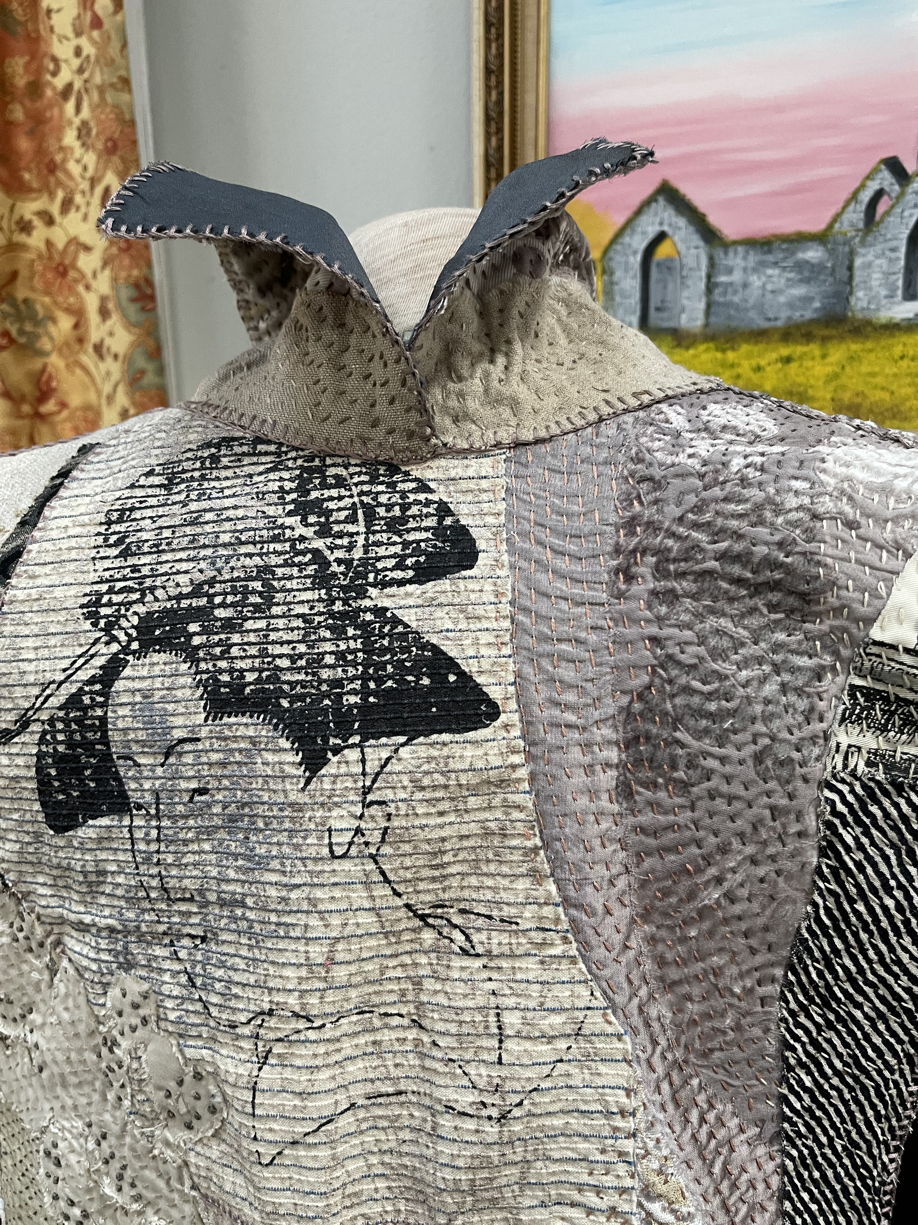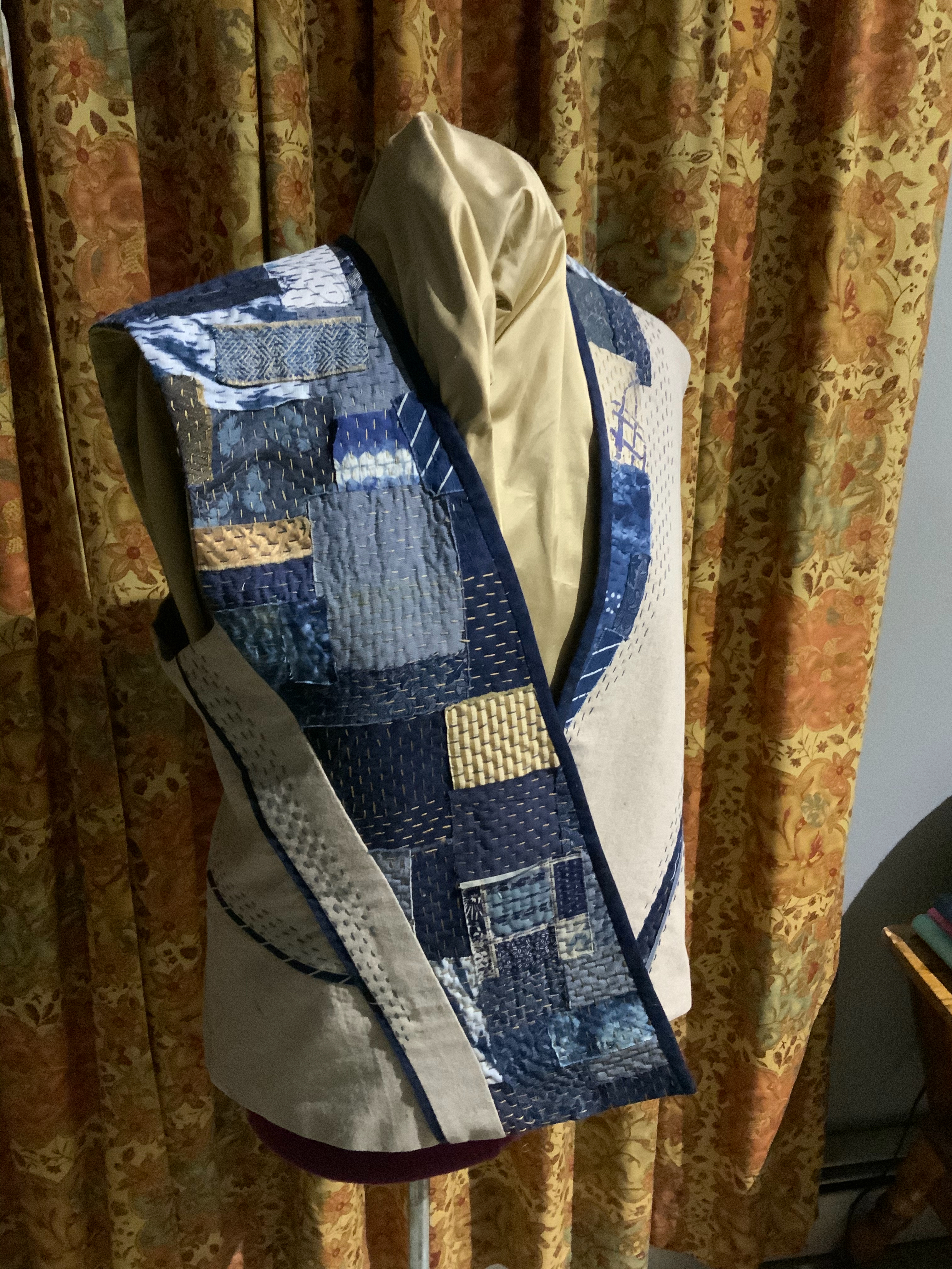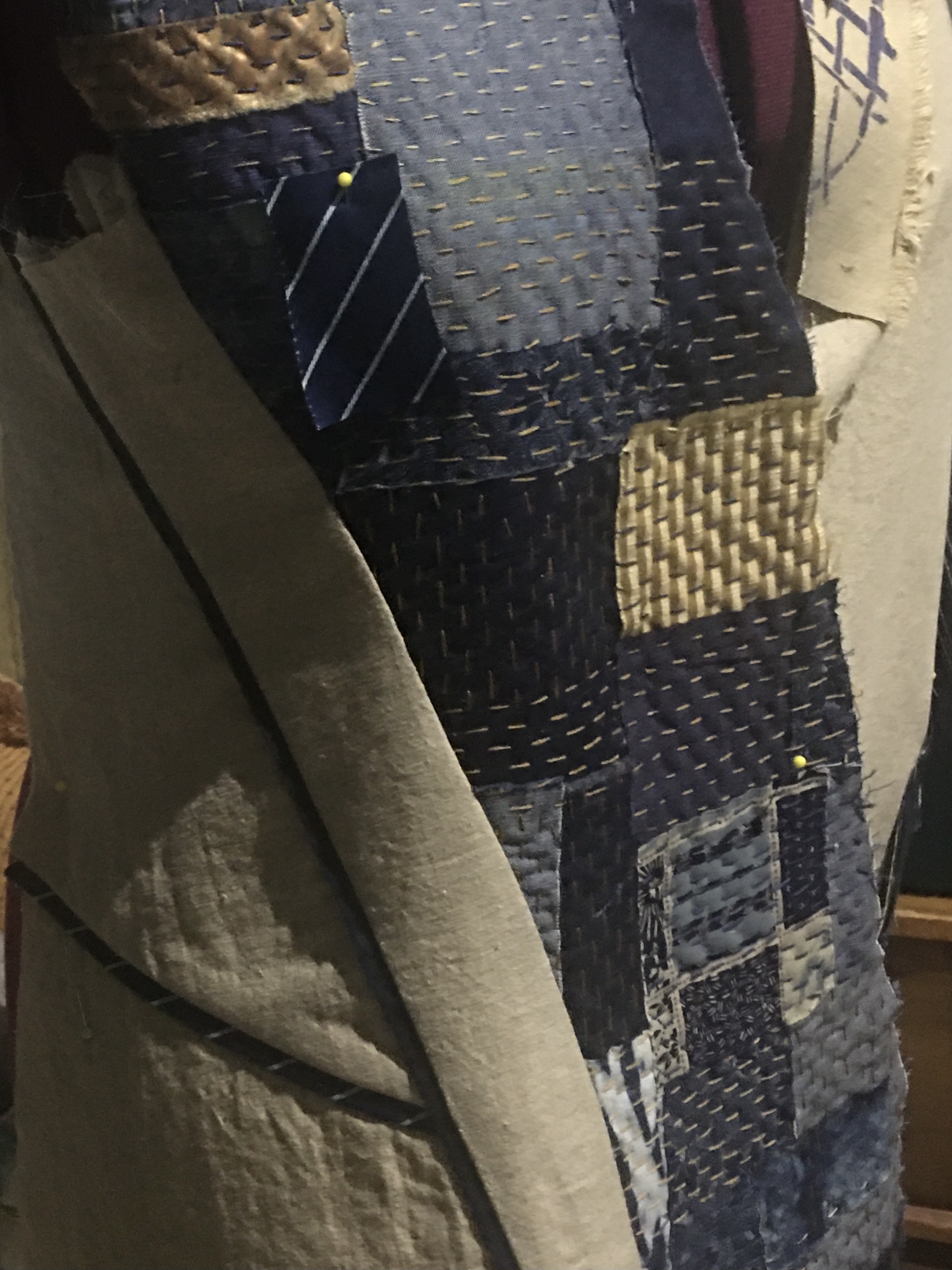 Moving on to the left side I had a new plan. I wanted less of the ‘Boro’ as I felt the vest would look ‘lighter’ and have more movement in the design. I again made a pattern and came up with an idea I liked,and after I pieced it together I put it on my dressform and decided on my fabric placement for the neck edge. After I was happy with it, I pinned the pieces in place and then hand stitched them to the linen.