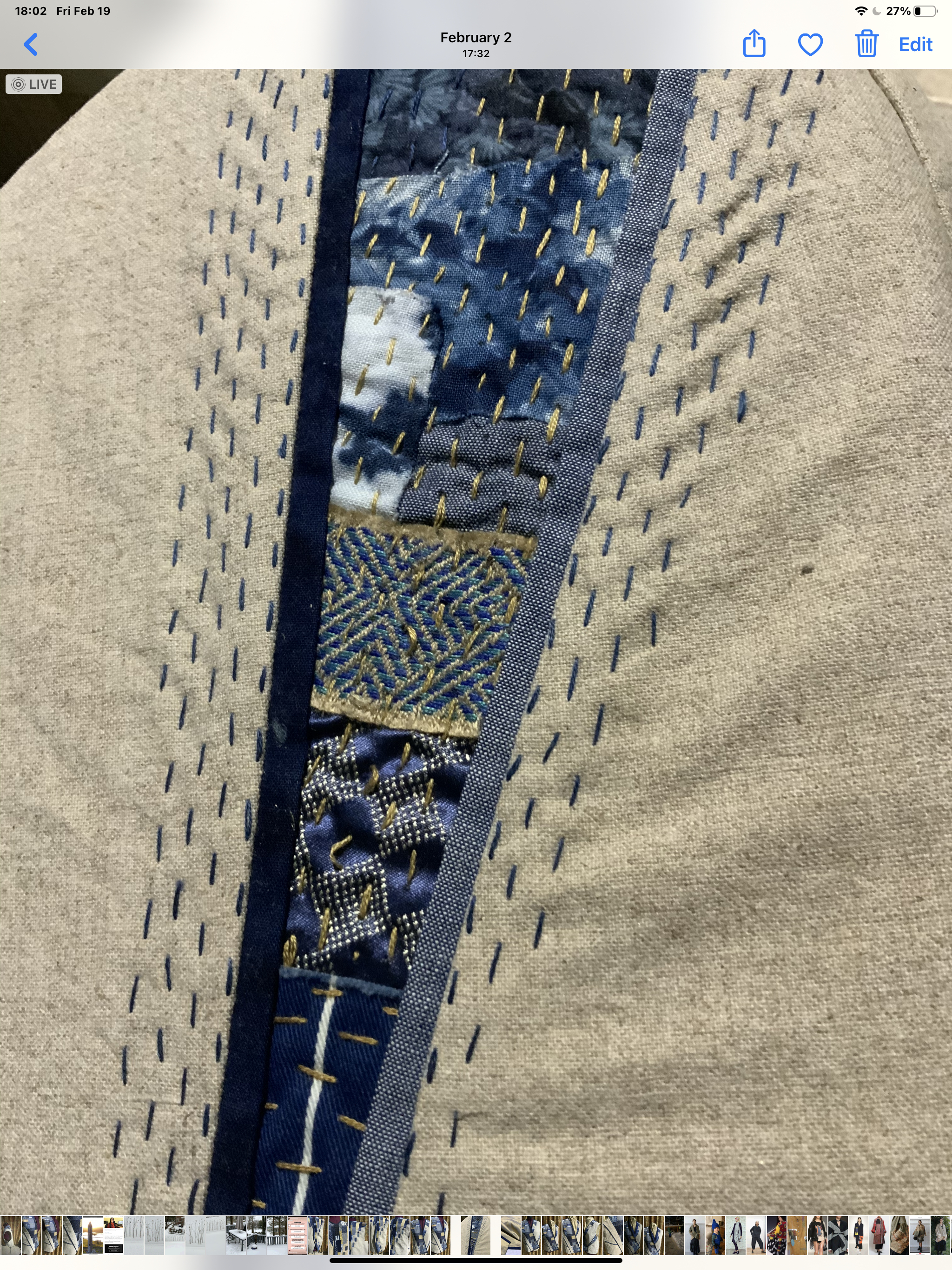 My next task was deciding on the back of the vest. I followed the same steps as the front, tracing the pattern pieces and played with a layout. I wanted to continue the Boro design over the shoulder so I had a seamless transition. Again I just kept adding textiles until I liked the outcome. Adding the hand stitches was enjoyable and I didn’t overthink it. When both sides of the back were finished. I put the vest together.
