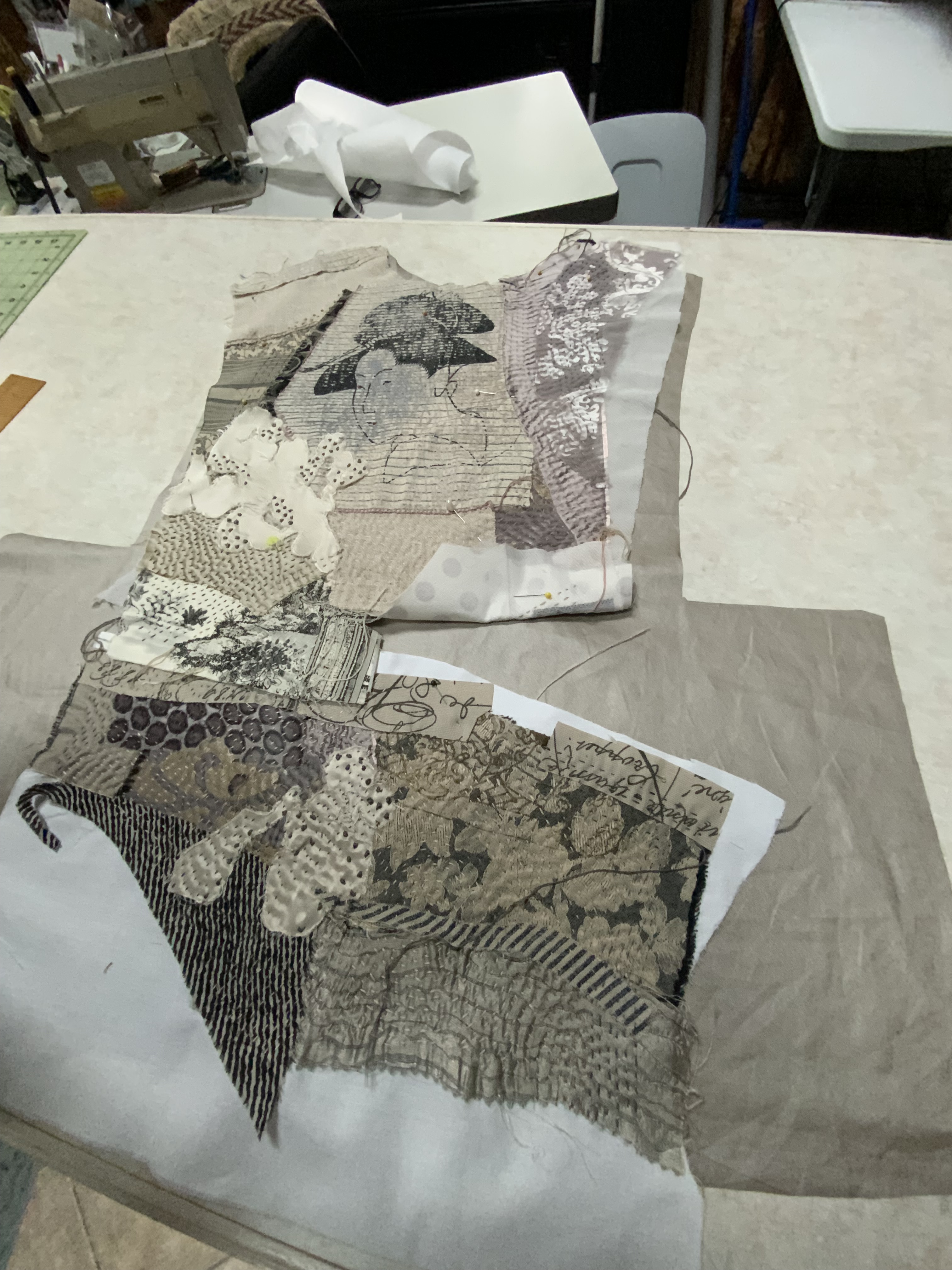 I continued to add fabric pieces and didn’t cover the main fabric completely as I like the look of some bare spaces and stitching that shows on the fabric.. This process takes a while as sometimes I had to walk away and revisit it with fresh eyes!