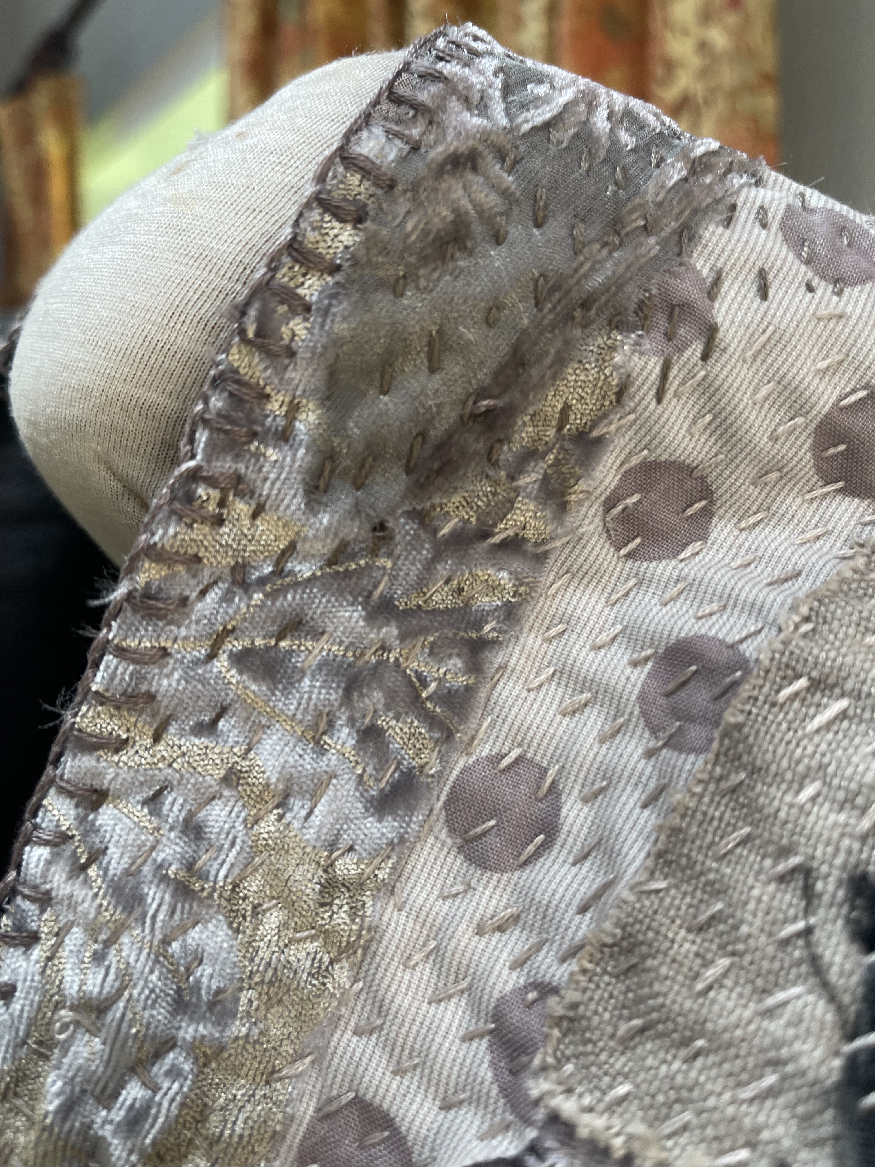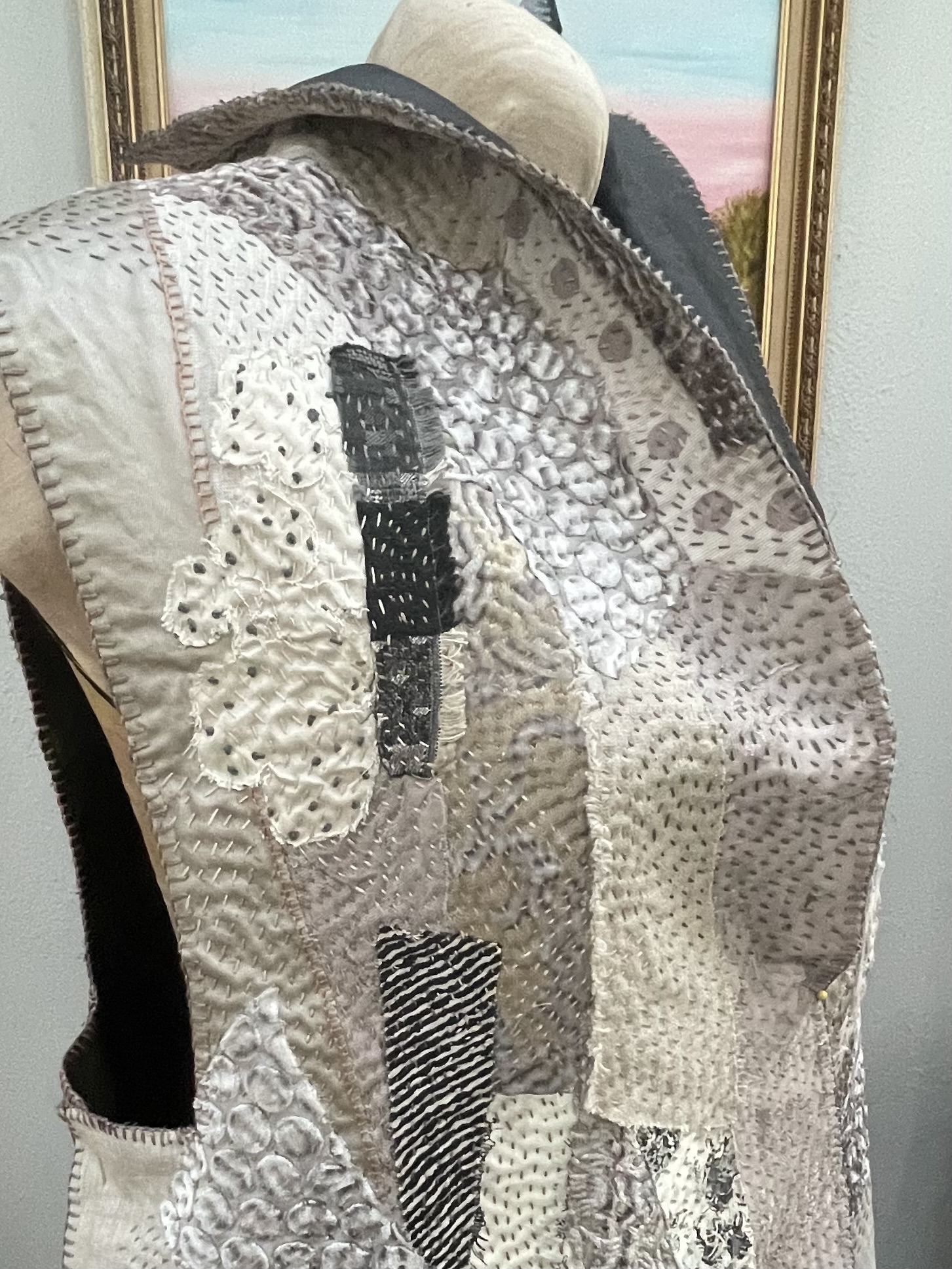 I have spent many many hours making garments on a sewing machine, and I didn’t plan on it, but I ended up making this garment entirely by hand. I have a huge obsession with hand stitching and have been making lots of samples and eventually came up with an idea to use all the ‘parts’ I had started. My collection of fabrics and leftover ‘gems’is extensive so I don’t have to buy fabric for new projects. I started without a plan for a design,and just used a collection of fabric pieces from previous projects and years of collecting. I love the combination of neutrals and pops of black.