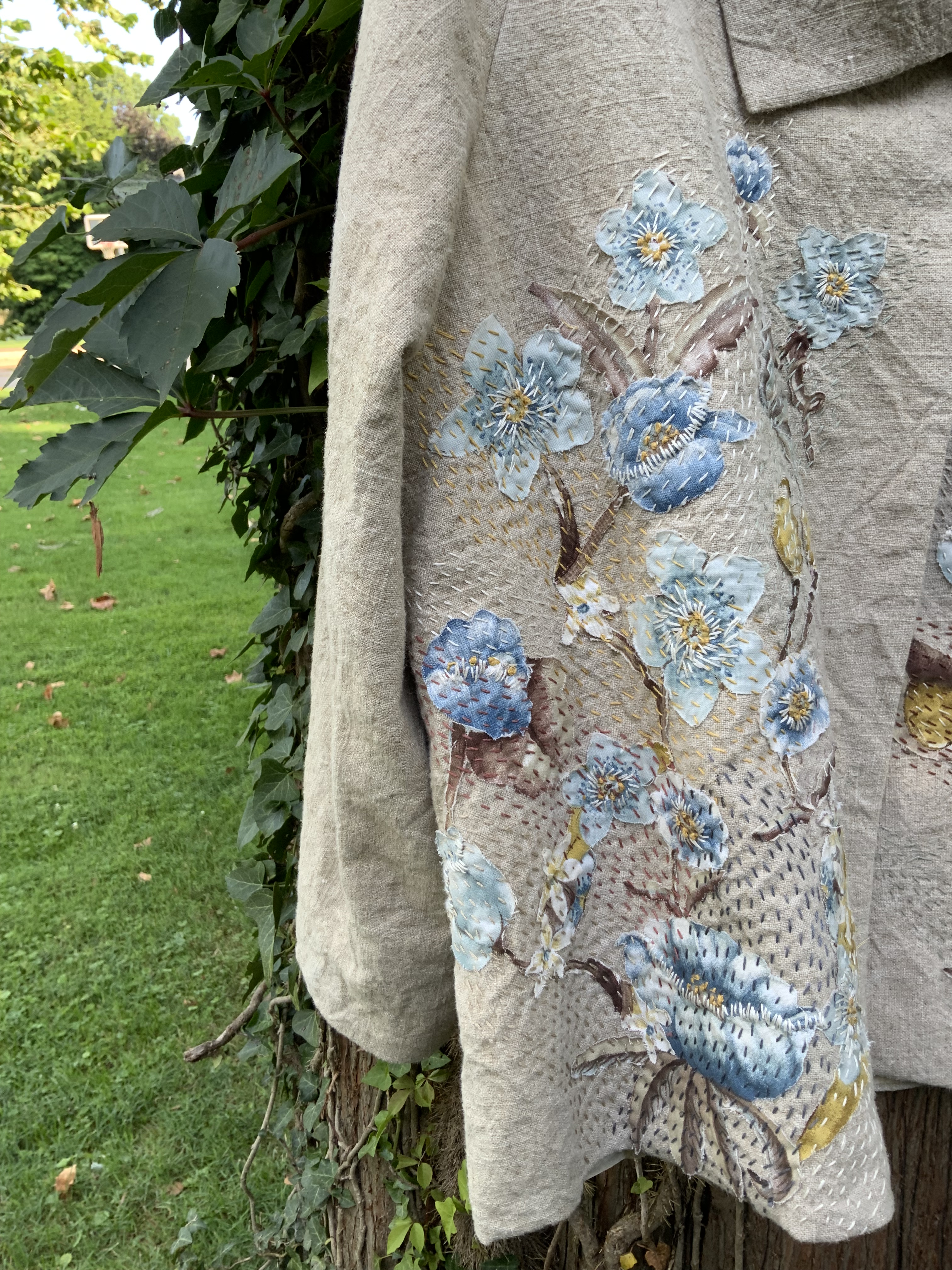 A favorite piece of fabric had the look and color that inspired me , so I began to cut the flowers , greenery etc.apart. I love Linen, so a rustic piece that I had wanted to use for a while was the perfect background. At this point I haven’t decided exactly what I was going to make but I knew it was going to be a Jacket.