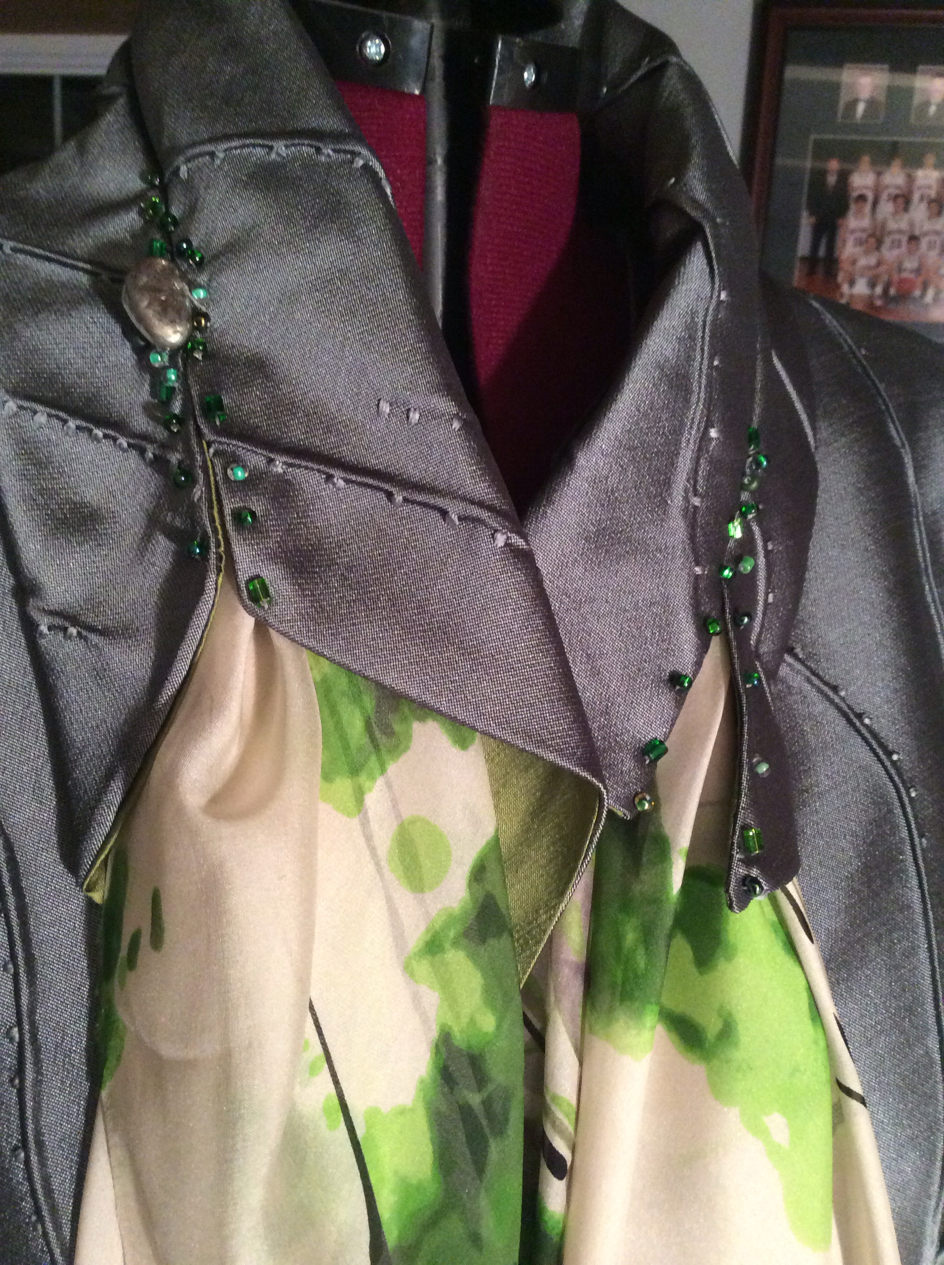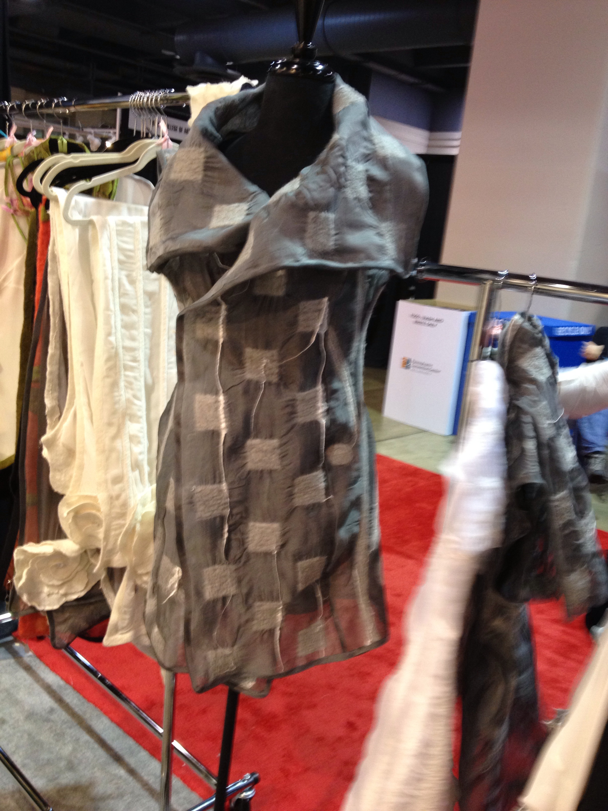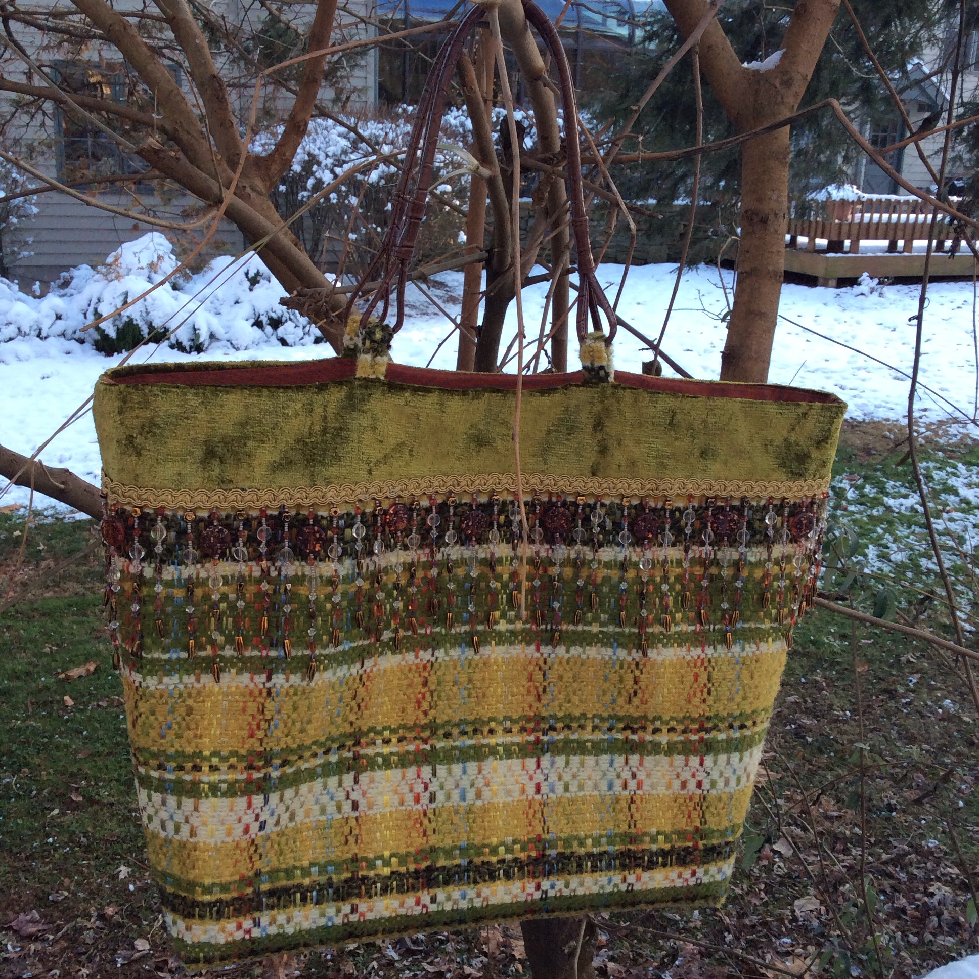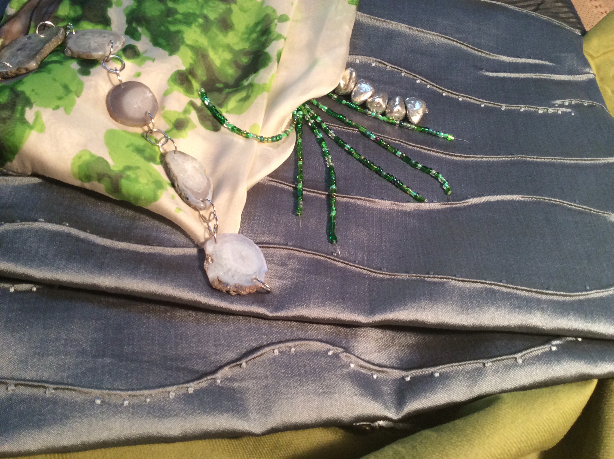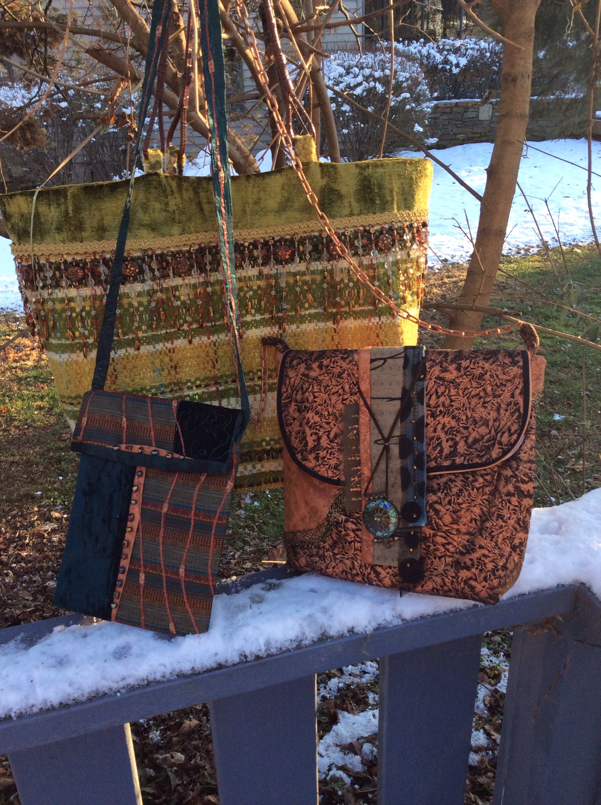 The smaller one is made from crushed velvet,taffeta, and a rayon home dec. fabric. I love to have the opportunity to add beading to my work. I also used knitting yarn for texture.