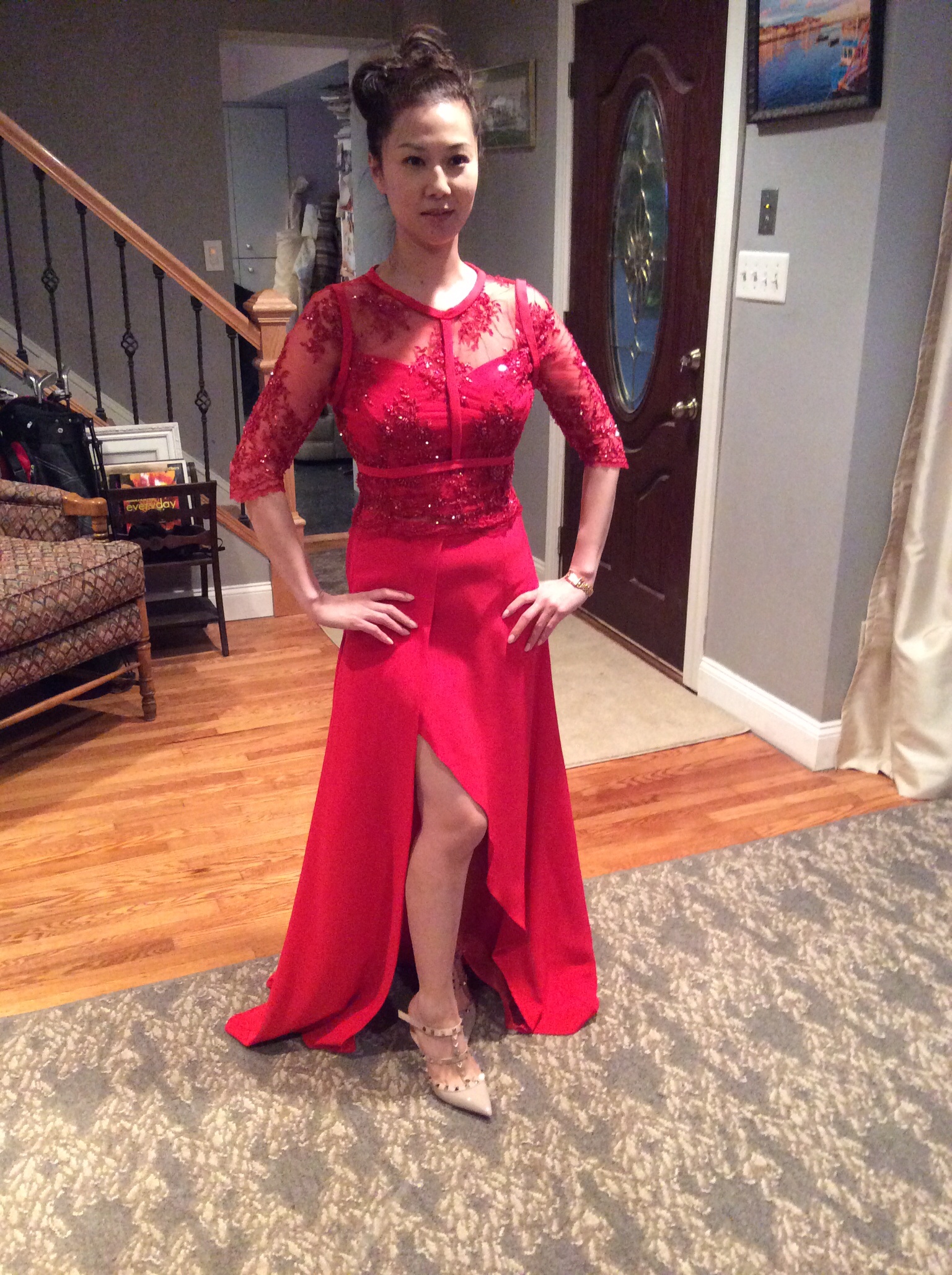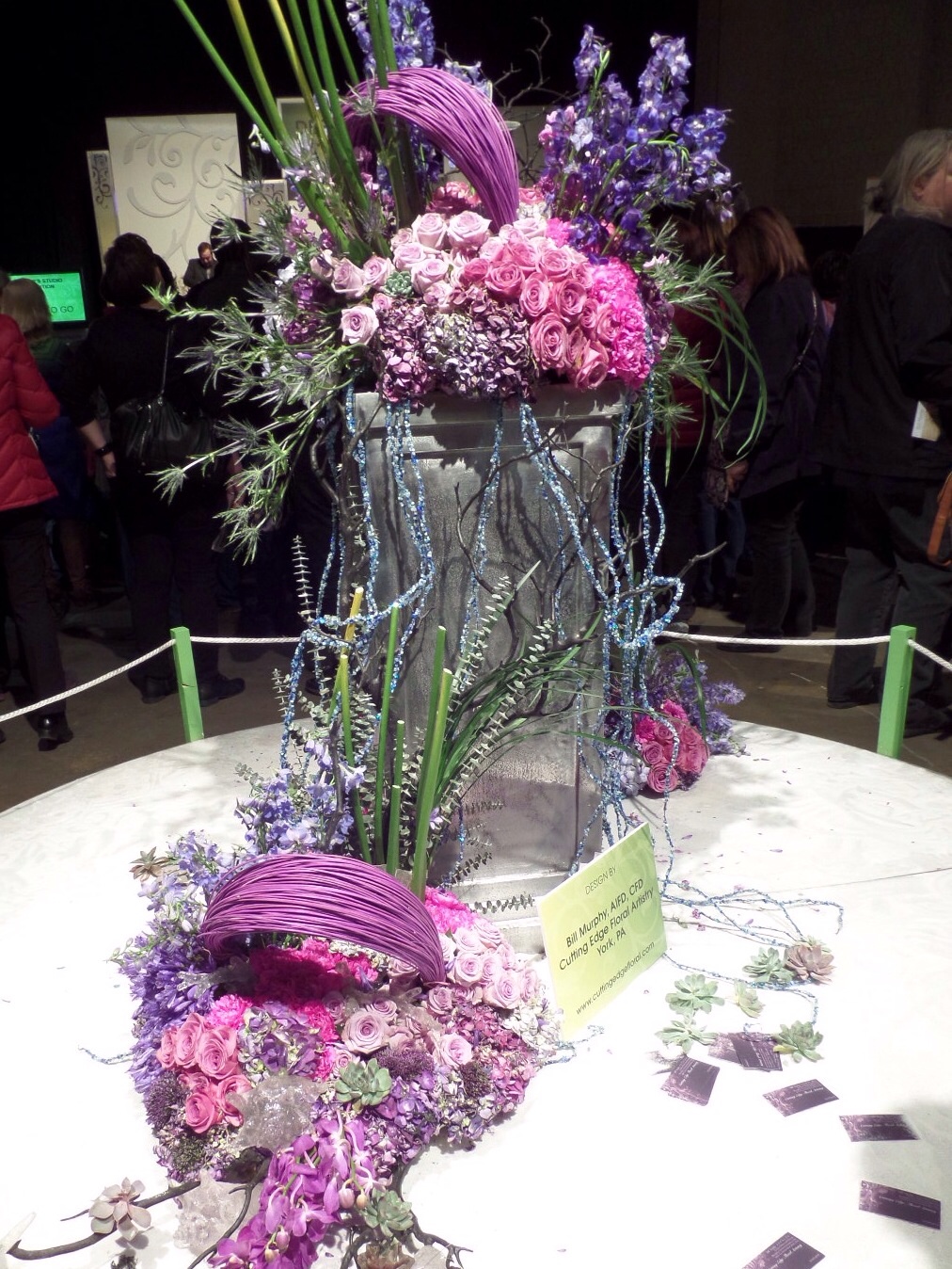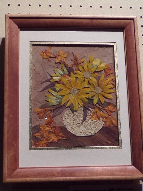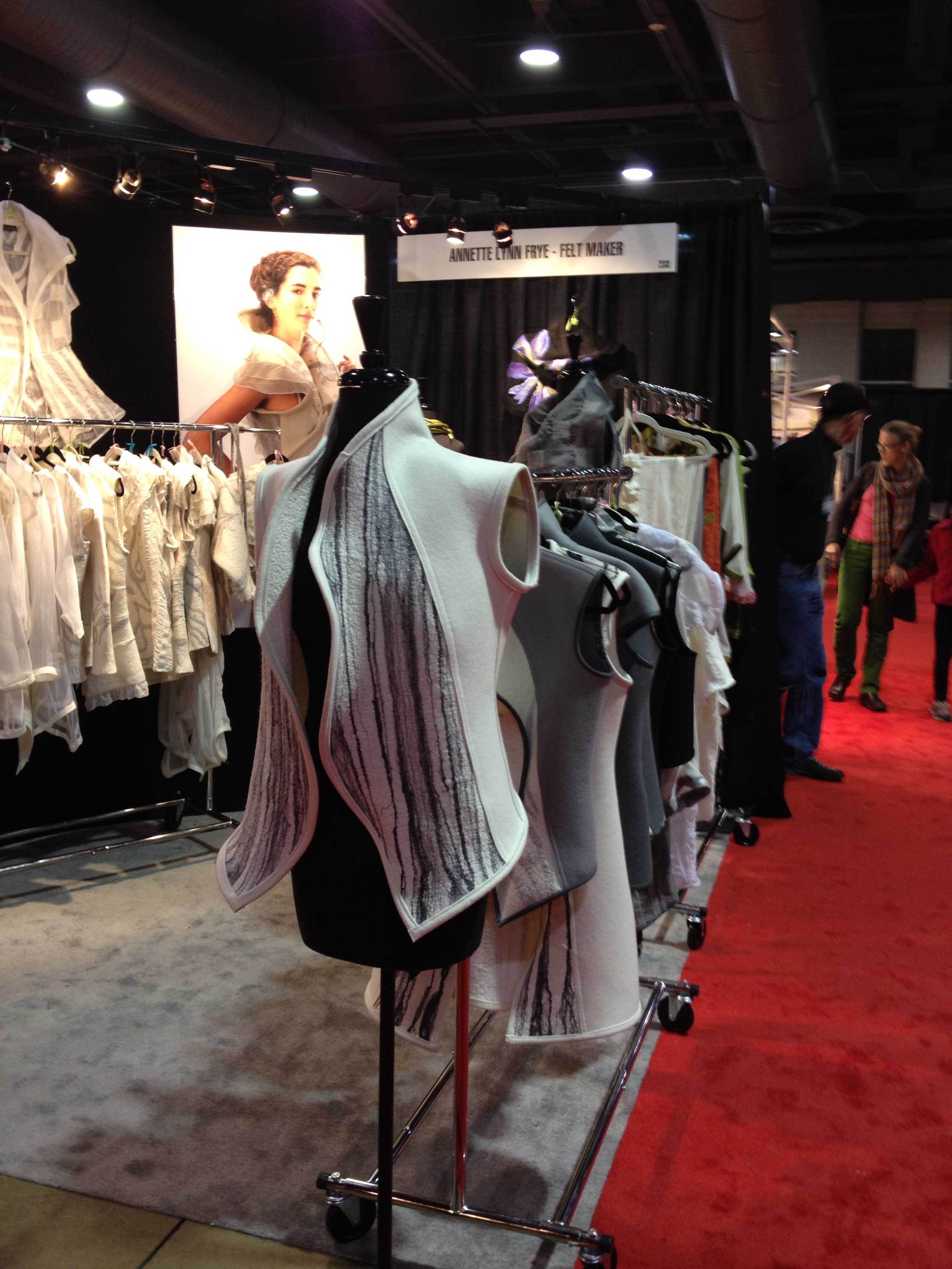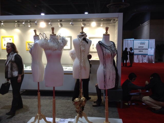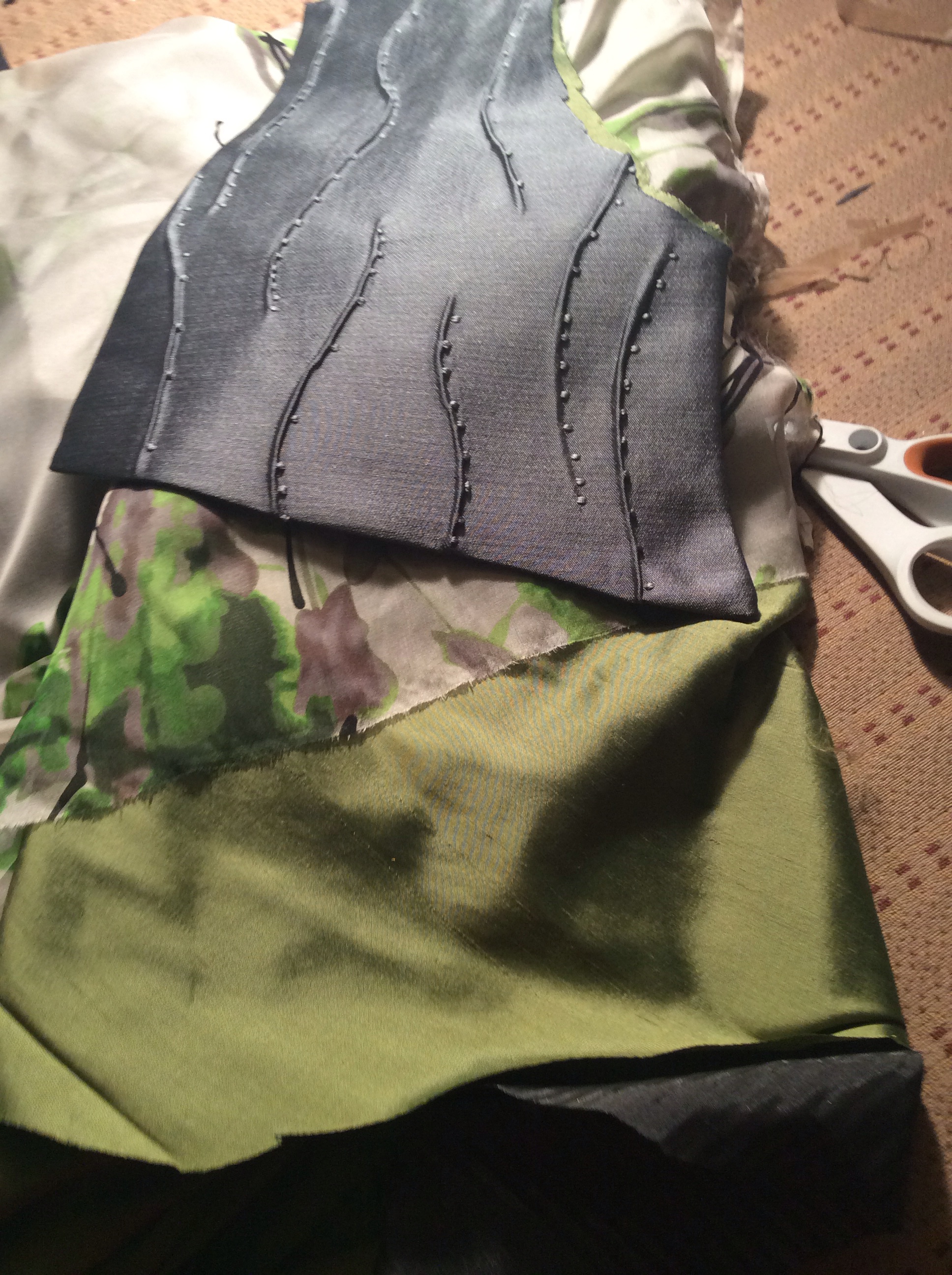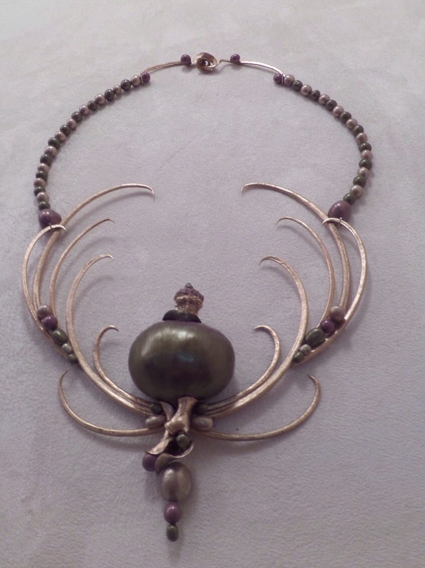 The smaller one is made from crushed velvet,taffeta, and a rayon home dec. fabric. I love to have the opportunity to add beading to my work. I also used knitting yarn for texture.