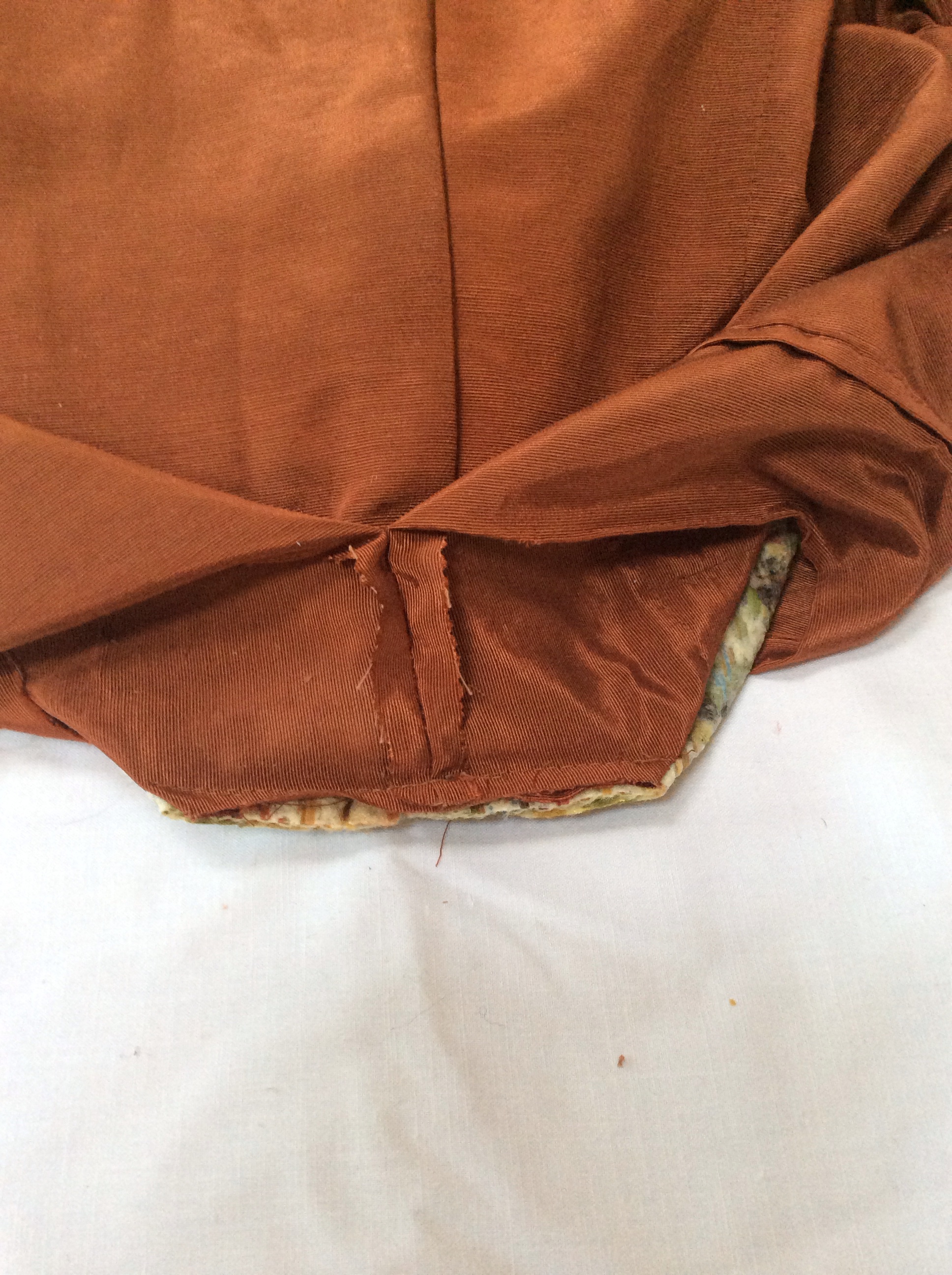 To finish the bag I open out the fabric and lining, put right sides together, and sew one continuous seam starting at the fabric end. Then I sew across the bottom of the main fabric and leave an opening in the lining to turn the bag right side out.